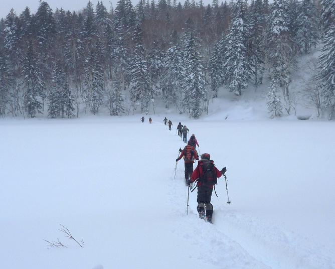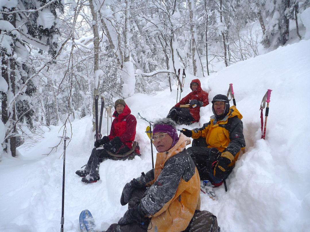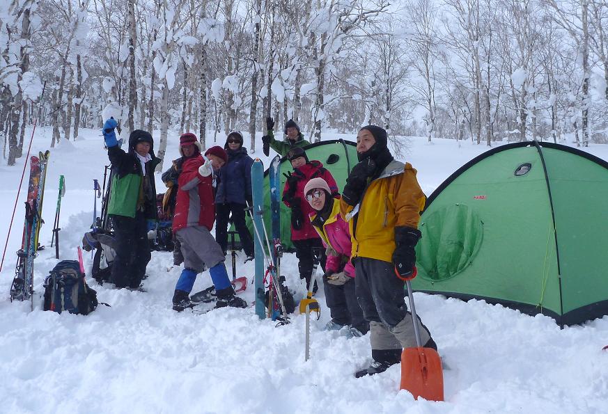 山びこからは14名の参加があり特に宴会?は盛り上がりました。 万計山荘からの下りのスキーでは、スノーブリッジではあわや・・(白井岳の二の舞)転倒がありましたが幸い無事下山しました。 @薪運びを終えてA山びこのメンバーB翌日は万計沼を渡り空沼岳へ |