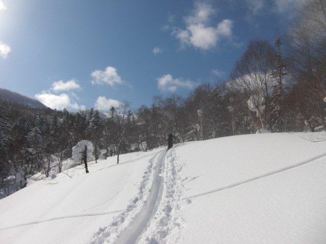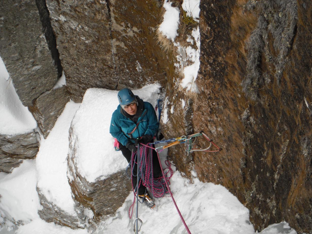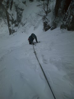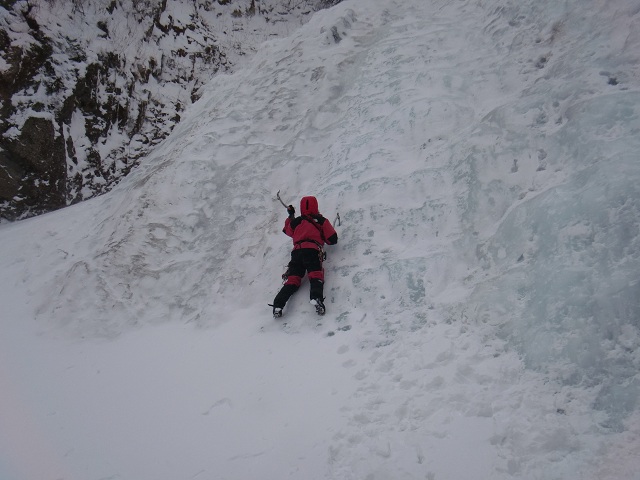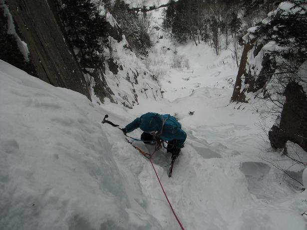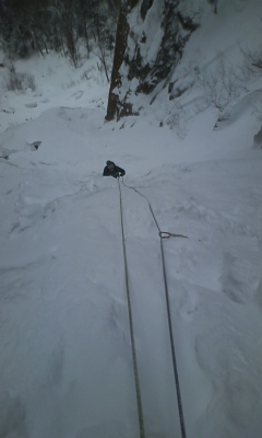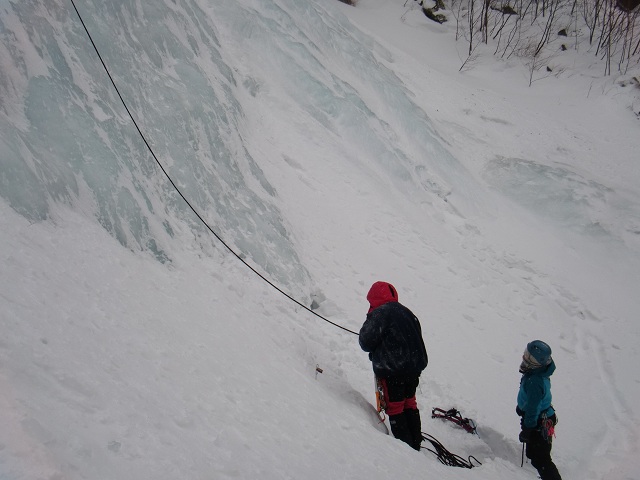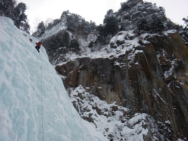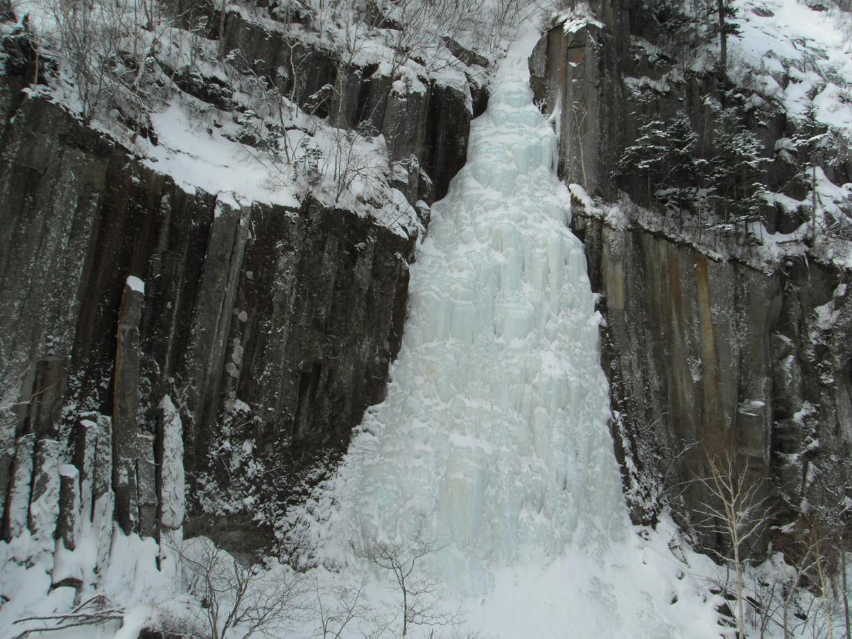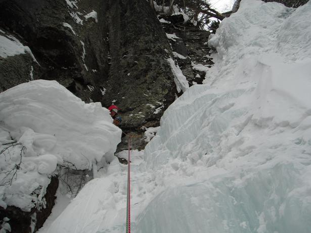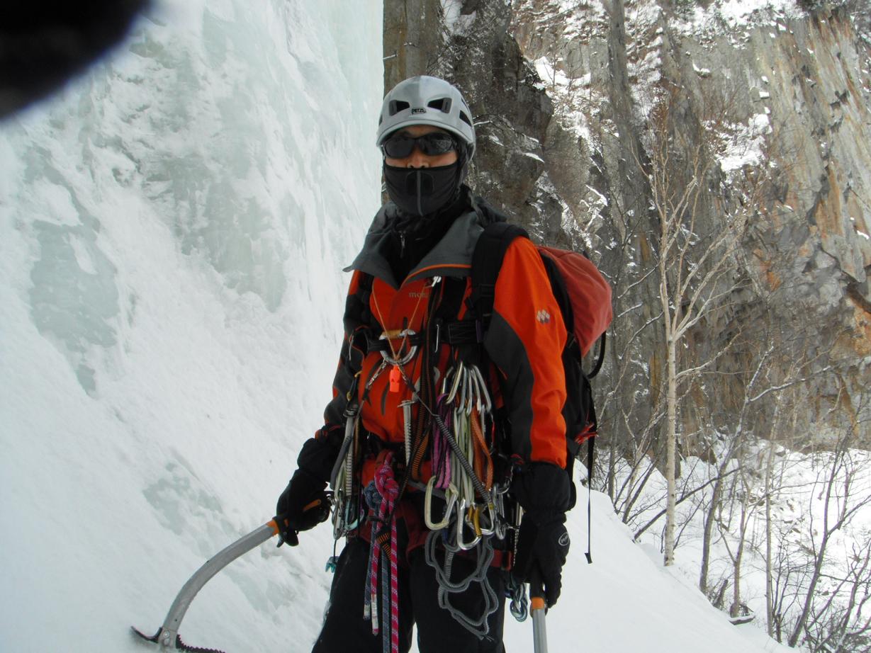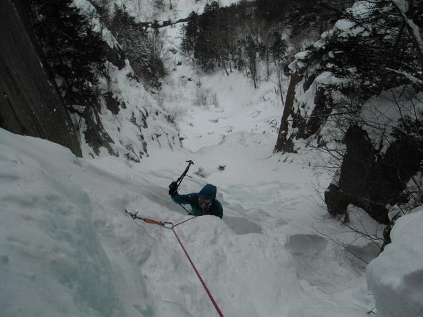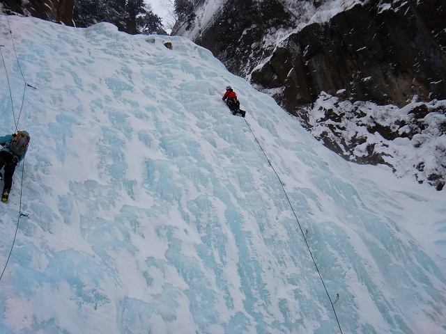 | F川と今シーズン最期のアイスに行ってきました。さすが三月になると気候も穏やかで、氷点下20度近かった時のピリッと刺すような感じはもうありません。日が高くなると氷も柔らかくなり、バイルの刺さりがとても良くなります。終わってみればF川とはアイスに都合6回来ていました。その甲斐あってF川もフォローでなら大体のところは登れるようになりまた。クォークも手に入れ来シーズンはリードと意気込んでいました(と思う)。 |