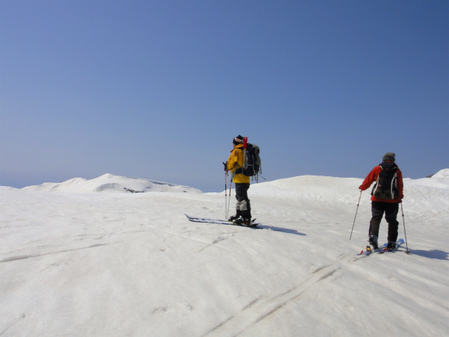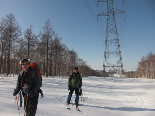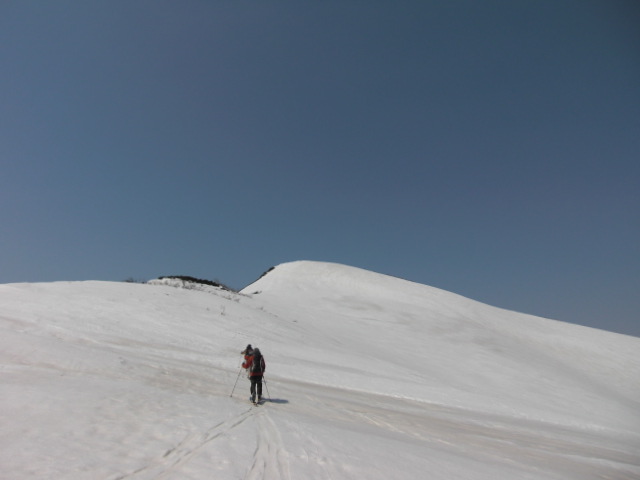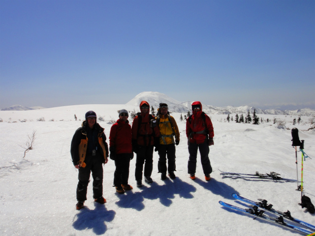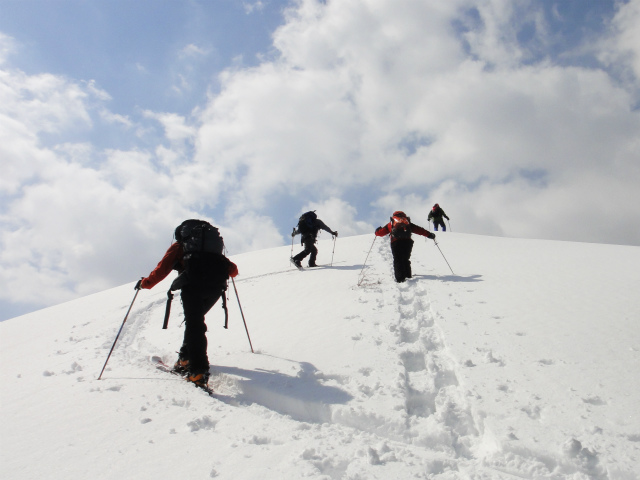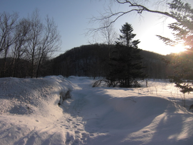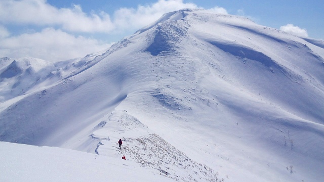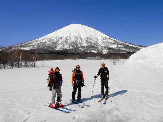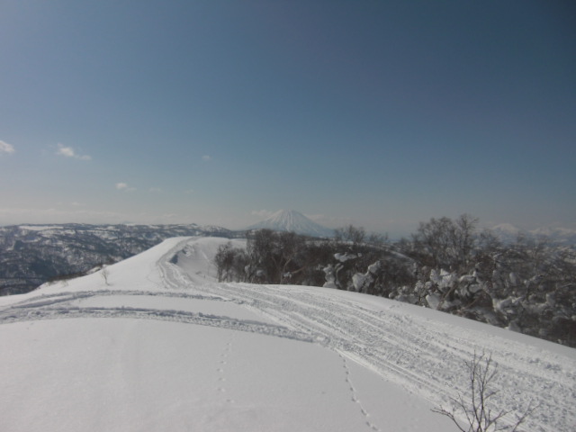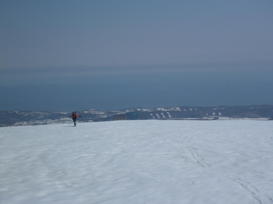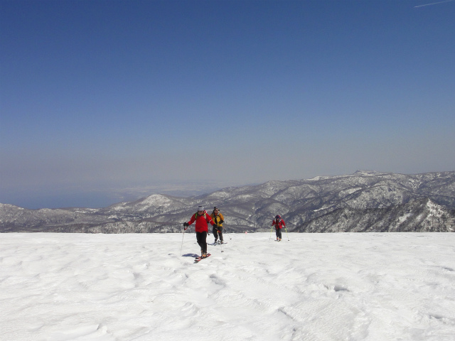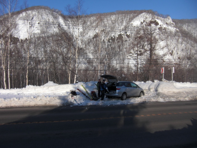メンバーはL・RyoMa、N沢さん、T橋(正)さんの3人。快晴&無風、絶好の山行日和である。2月12日(日)に初挑戦するも、荒天&ラッセルのため3時間50分かけても頂上に着けず、吹雪が強くなり頂上手前1.5km付近でやむなく撤退。今回その再チャレンジ(N沢さん、RyoMa)山行に成功しました。雪も締まっておりラッセルもなく順調にぐいぐいと上って頂上へ。コースタイム:上り3時間20分、頂上にて休憩30分、下り1時間30分。合計タイム5時間20分。 スノーモービルの走行跡があちこちに見られ、今回は頂上にて休憩中に6台ほどのスノーモービルがあっという間に我々の横を通り過ぎて行きました。 写真@7:02 除雪して車を国道393号脇に駐車し出発の準備。 写真A9:47 887mポコを右に見てトラバースする。 写真B10:42 阿女鱒岳頂上にて。 写真C 頂上より南西方向に「羊蹄山」がくっきりと見える。稜線上にスノーモービルの走行跡が何本もついている。 |