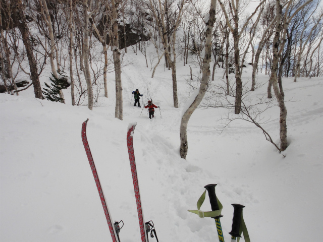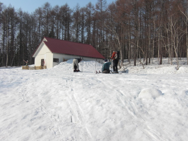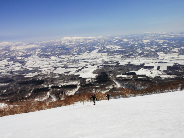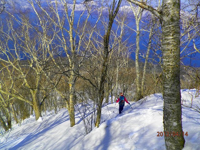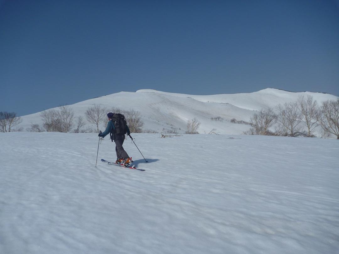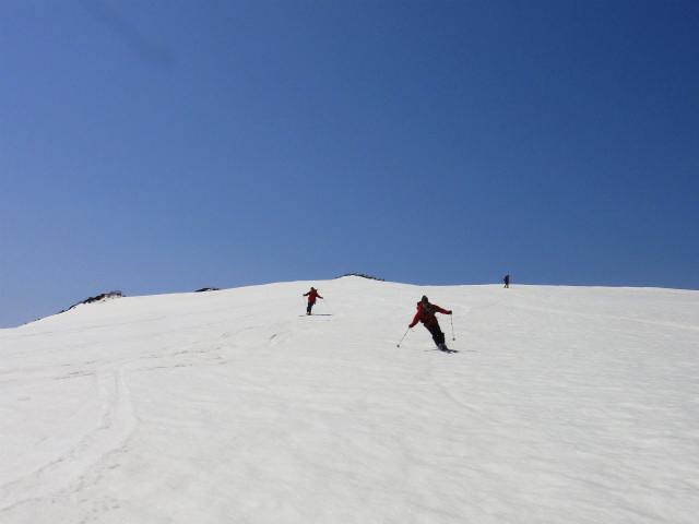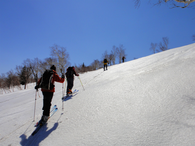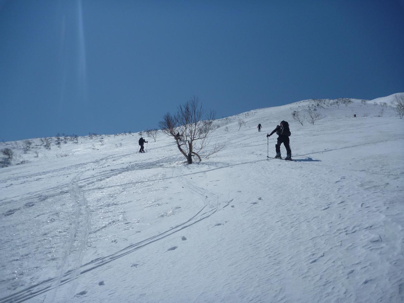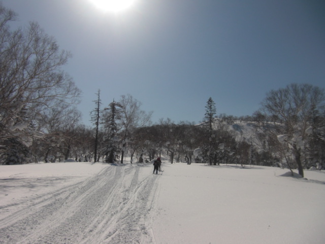 メンバーはL・RyoMa、N沢さん、T橋(正)さんの3人。快晴&無風、絶好の山行日和である。2月12日(日)に初挑戦するも、荒天&ラッセルのため3時間50分かけても頂上に着けず、吹雪が強くなり頂上手前1.5km付近でやむなく撤退。今回その再チャレンジ(N沢さん、RyoMa)山行に成功しました。雪も締まっておりラッセルもなく順調にぐいぐいと上って頂上へ。コースタイム:上り3時間20分、頂上にて休憩30分、下り1時間30分。合計タイム5時間20分。 スノーモービルの走行跡があちこちに見られ、今回は頂上にて休憩中に6台ほどのスノーモービルがあっという間に我々の横を通り過ぎて行きました。 写真@7:02 除雪して車を国道393号脇に駐車し出発の準備。 写真A9:47 887mポコを右に見てトラバースする。 写真B10:42 阿女鱒岳頂上にて。 写真C 頂上より南西方向に「羊蹄山」がくっきりと見える。稜線上にスノーモービルの走行跡が何本もついている。 |