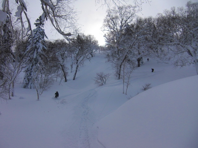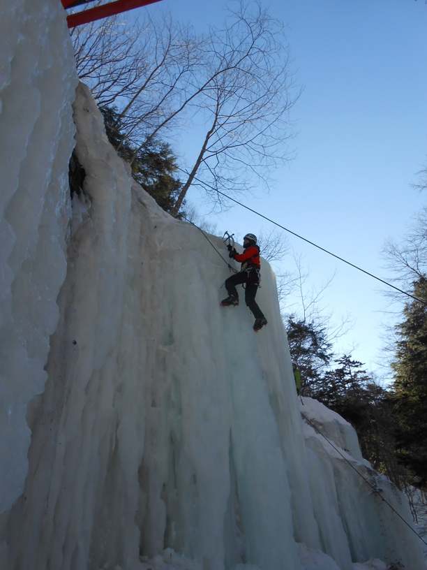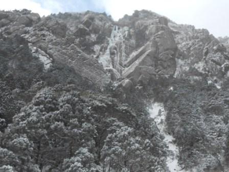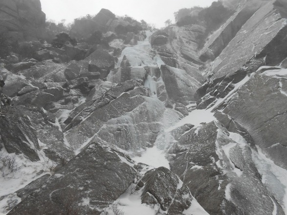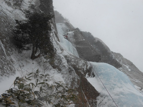 | 二回目の御在所はアイス目的で中俣ルンゼへ。御嶽山麓アイスに引き続き下京山岳会のチョーさんの案内です。御在所には中俣・奥俣・第三の三つのルンゼがありますが、この中では中俣が一番面白い(チョーさん談)とのこと。3ピッチあるスケールの大きいクライミングが楽しめます。ただアプローチが取り付きまで二時間ほどかかり、途中急斜面のラッセルもあります。中俣はアイスと言っても層雲峡のように滝が凍ったものではなく、岩からの染みだしが凍ったものです。かこう岩をに薄く氷が付いただけの部分も多く、場所によってはメチャクチャ氷が薄く難しかったです純粋なアイス用のピックだとすぐに丸くなってしまいます。今回は聾唖の若者が一緒で、話して聞くという健常者に当たり前のコミュニケーションがとれません。そんな状況でパーティーを組むのはとても難しかったです。しかも途中で若者が登れなくなってしまいかなり時間がかかってしまいました。若者はマルチのアイスに行ける機会も限られているようで、大変残念がっていました。それでも下山後温泉に浸かり、彼の案内で四日市周辺エリアのB級グルメ「トンテキ」を頂いて帰路につきました。 |