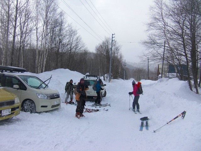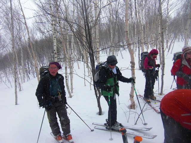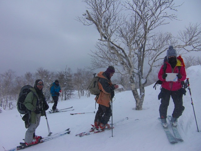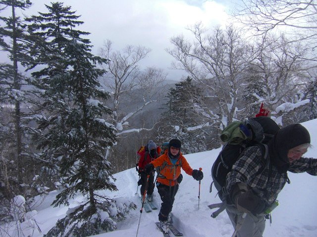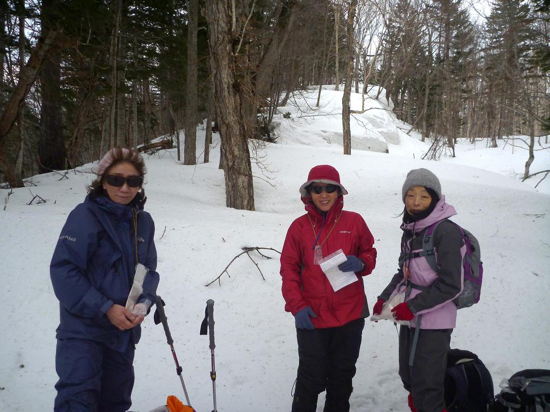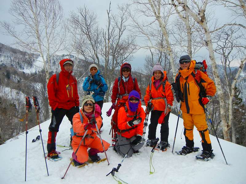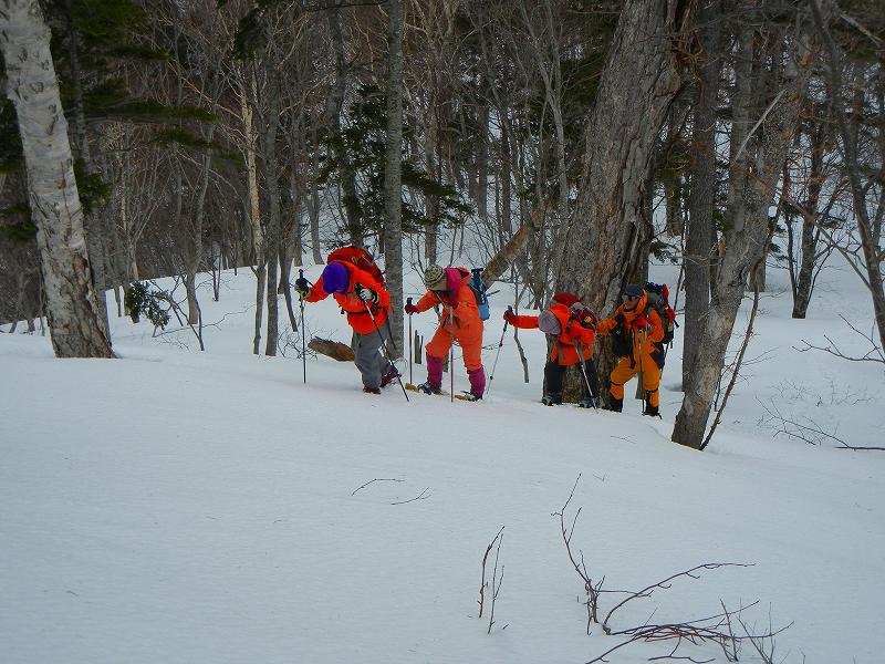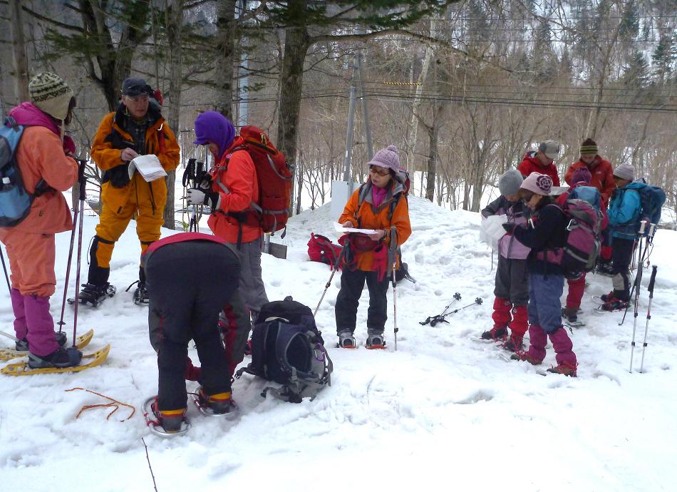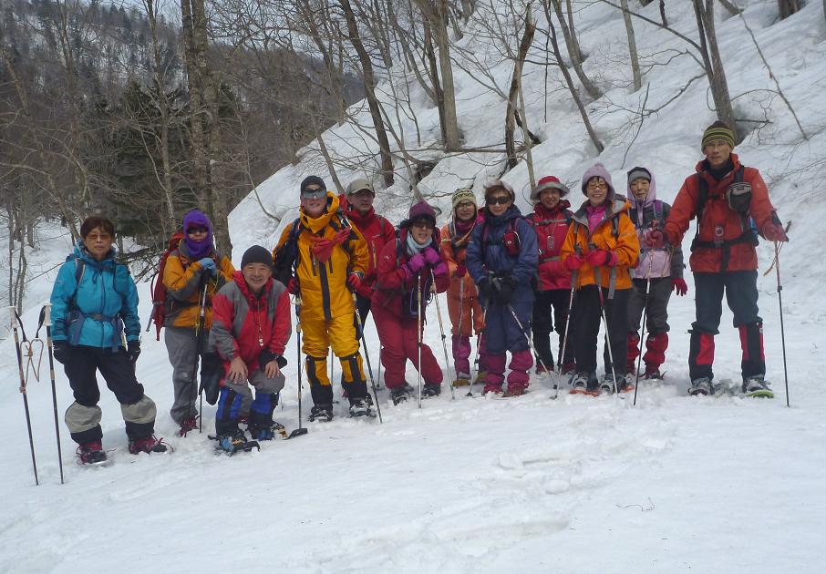 | L Tado・SL Y松さんの迷い沢山の読図山行(12名・ワカンorスノーシュー)に参加しました。昼から荒天予想の為11時行動停止で、Aチームは上平沢林道を往復、Bチームは上平沢林道から東の尾根に登り林道に降りる循環コース、我々Cチーム(A井・Y下・S藤さんにUeno)は上平沢林道入口からすぐ西側の尾根へ登り694m〜793mまで尾根を歩き南の尾根を下り林道へくだる循環コースです。読図山行でなければ歩くことが無いような藪コースでしたがそれなりに楽しめました。@各チーム出発準備A登山口すぐ西側の急登をB急登を登るA井さんC694mポコのまえで読図する |