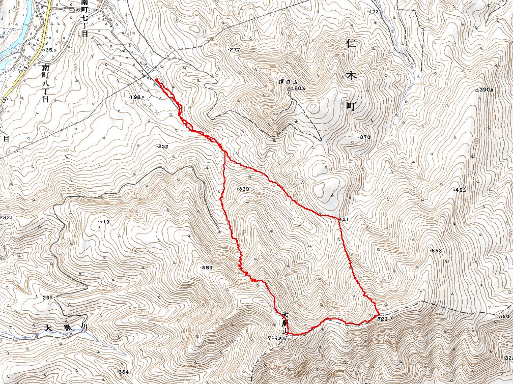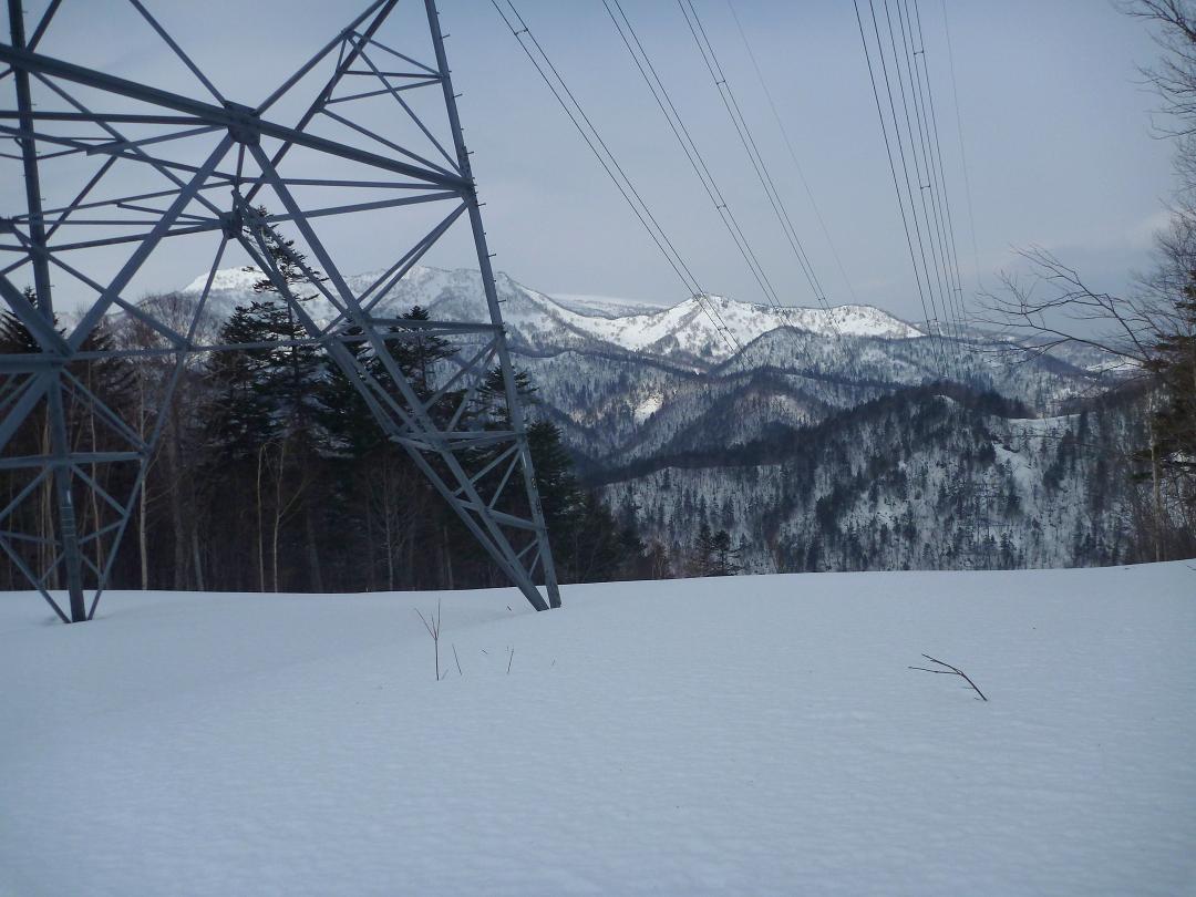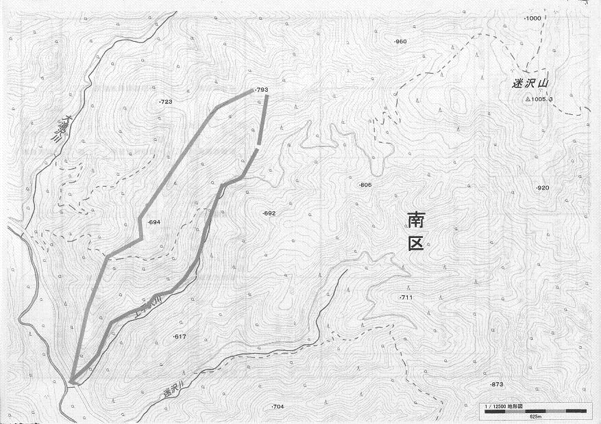 | 写真を@793mポコの前の鉄塔がある緩い尾根、左から白井岳・長伯稜・股下山(と思う)A林道に降りて各チームが合流しました。BCチームのコースルート |