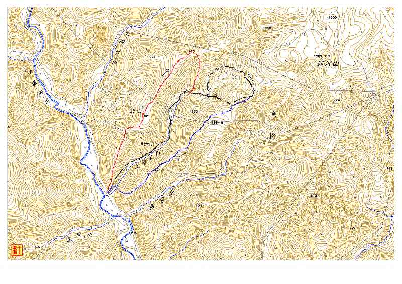 @Aチーム出発前の打ち合わせ。 Aめざす小ピークCo806m直下の急斜面を登るBチーム。 B小ピークCo806m頂上で。ABチーム。 C3チームのルート図。 |