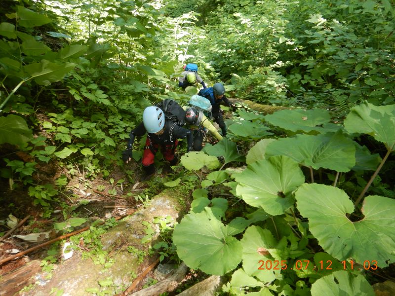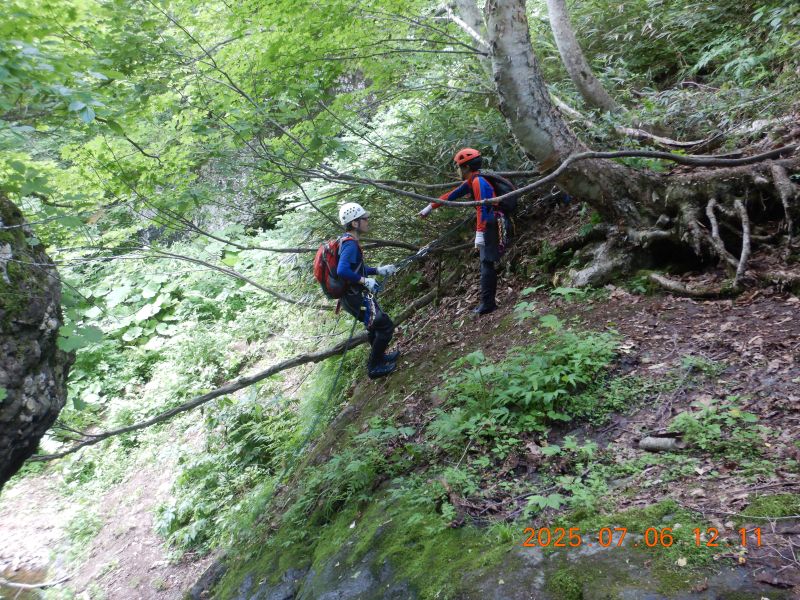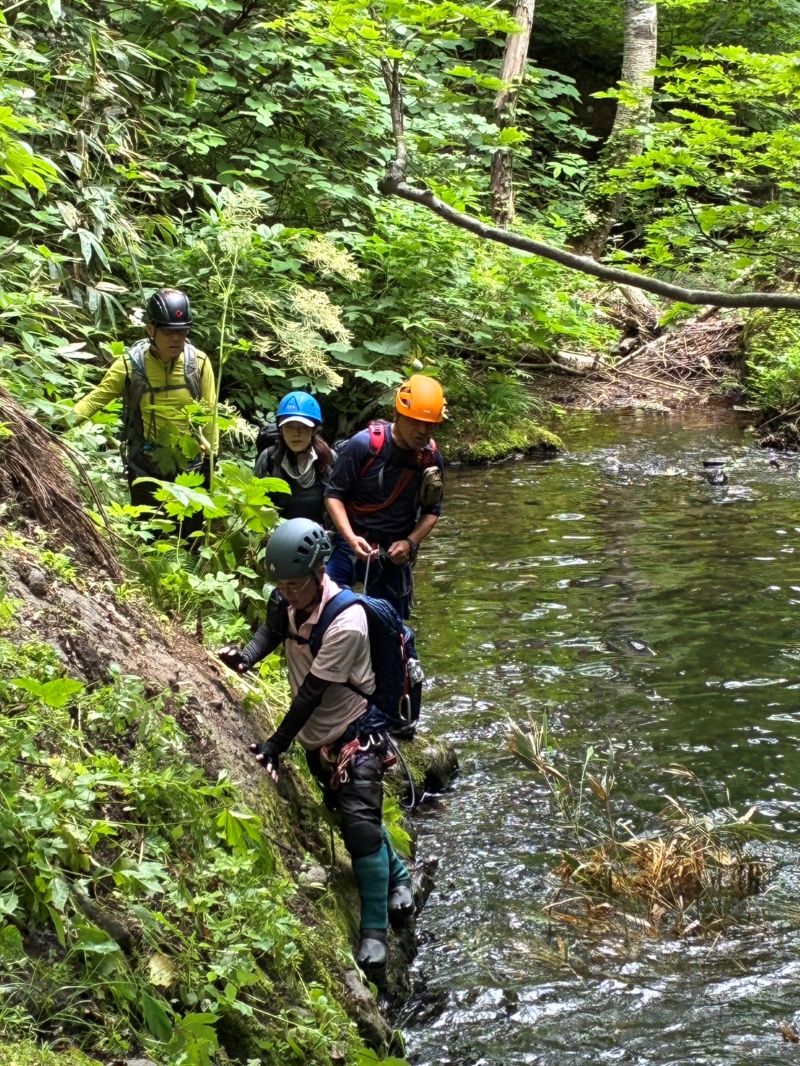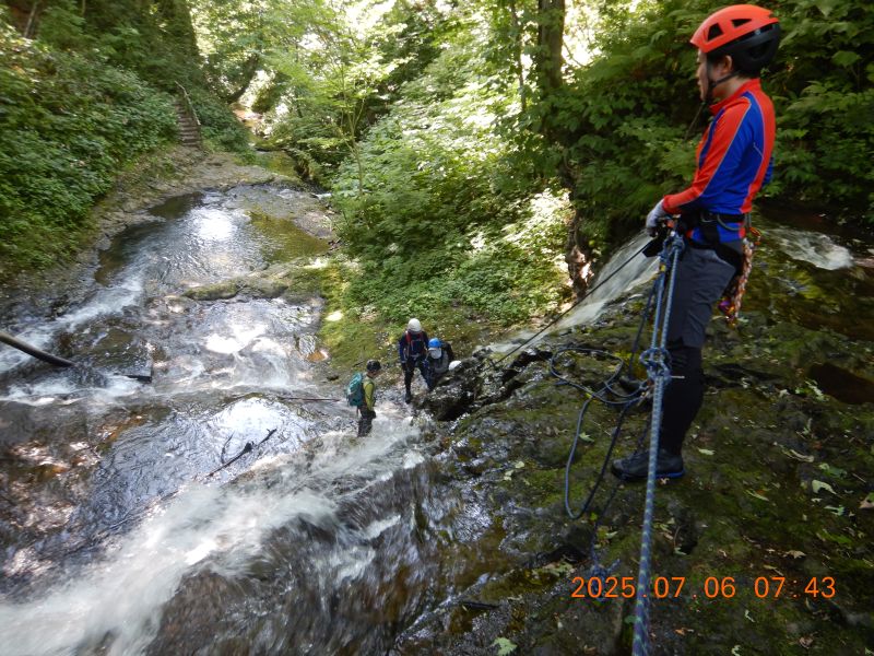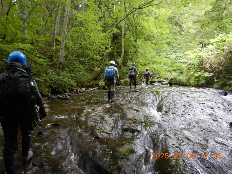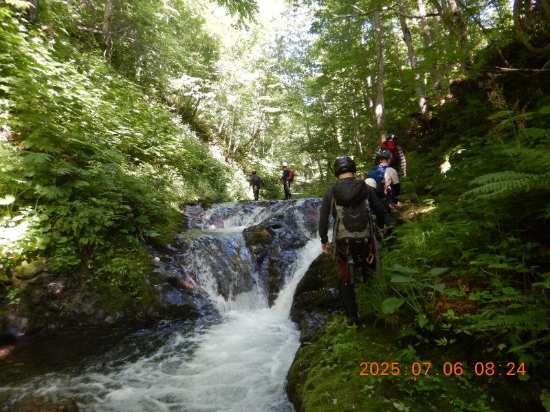 7月6日と12日、札幌近郊で沢入門を2回実施した。6日の入門者は4名、12日は1名。当会としては久々の多人数。6日は「琴似発寒川」、平和の滝〜450m付近まで。12日は真駒内川支流「湯の沢」、長沼手前の林道まで。両日とも快晴、気温も高く絶好の沢日和だった。コーチ会員の連中の方が楽しんでいたような気もする。当会での沢登りは、老齢化や沢志向会員の退会等のため、やや低調気味だったが、今後また活発になる予感もするが・・・・どうだろう、今回の入門者次第なのは間違いないだろう。