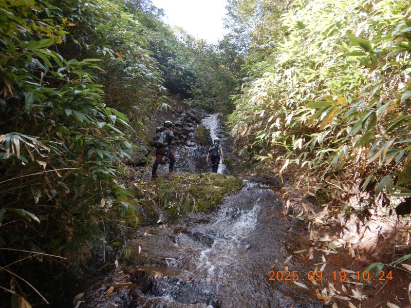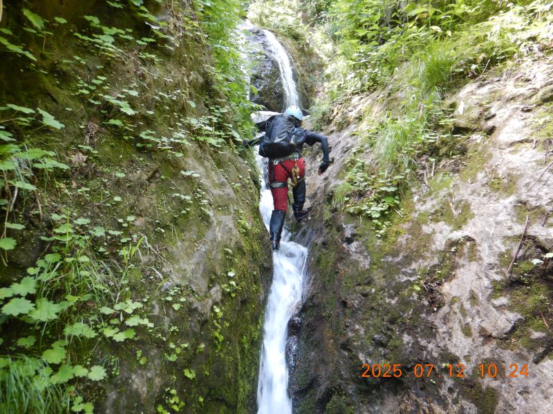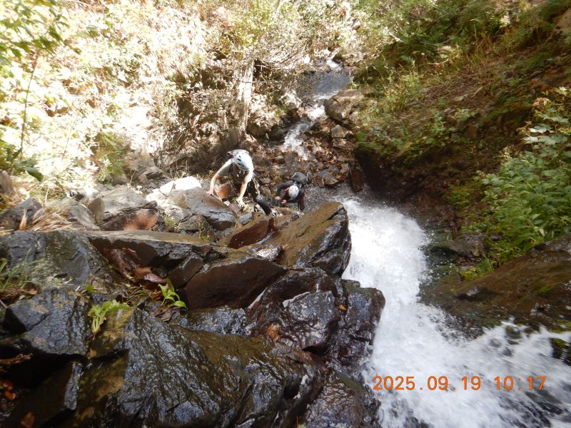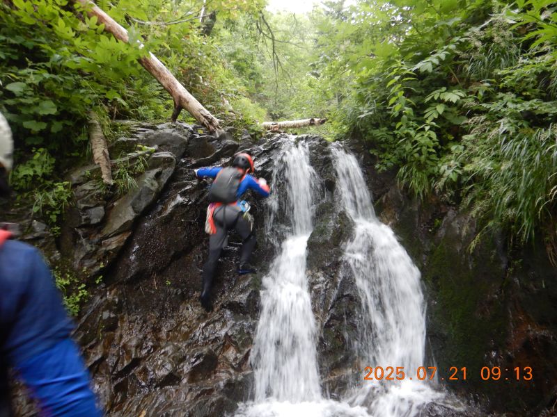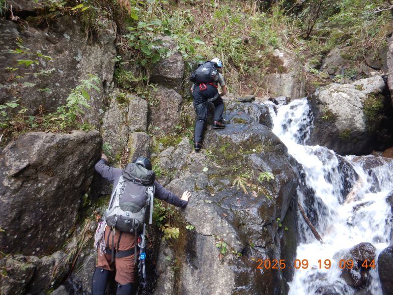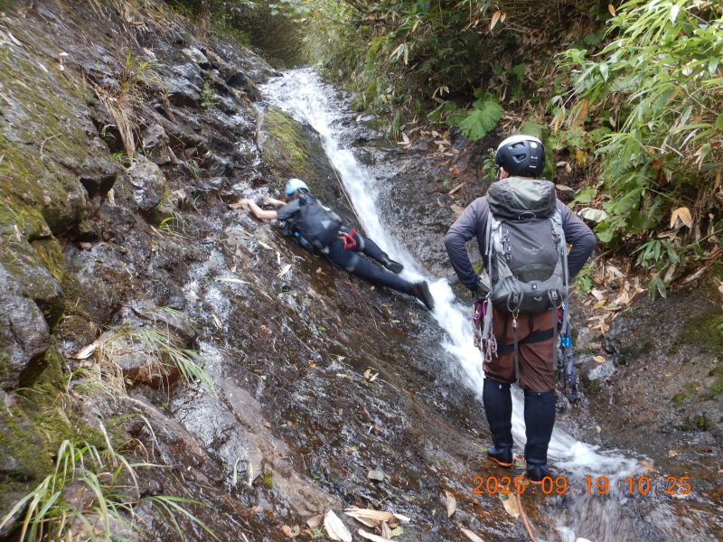 樋状の滝を果敢に登っていく入門者O