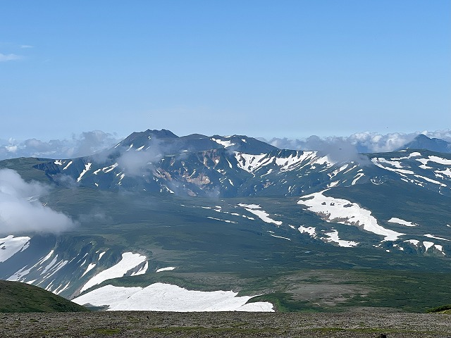 小泉岳から小泉平へ歩いていくと高根ヶ原に落ち込むように残雪が残るトムラウシがくっきりと美しい。気分一気に上昇モード。