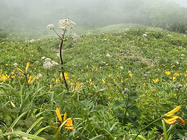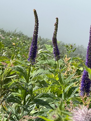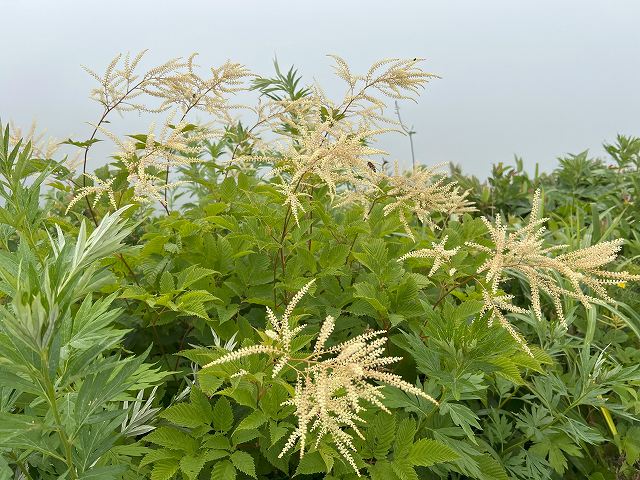 青い穂状の花が個人的に大好きなエゾクガイソウや小さな花が集まってふわふわ綿菓子のように咲くオニシモツケがたくさん咲いていた。あちこちにエゾノヨロイグサだろうか?あまり美しいとは思えないけれど、すっくり立った感じが斜面の中でポイントになっている。ほかにもカワラナデシコとか、ショウマが(やまぶきなのか、とりあしなのか・・・これはたぶんヤマブキショウマ?)斜面いっぱいにまじりあって咲き競っていた。