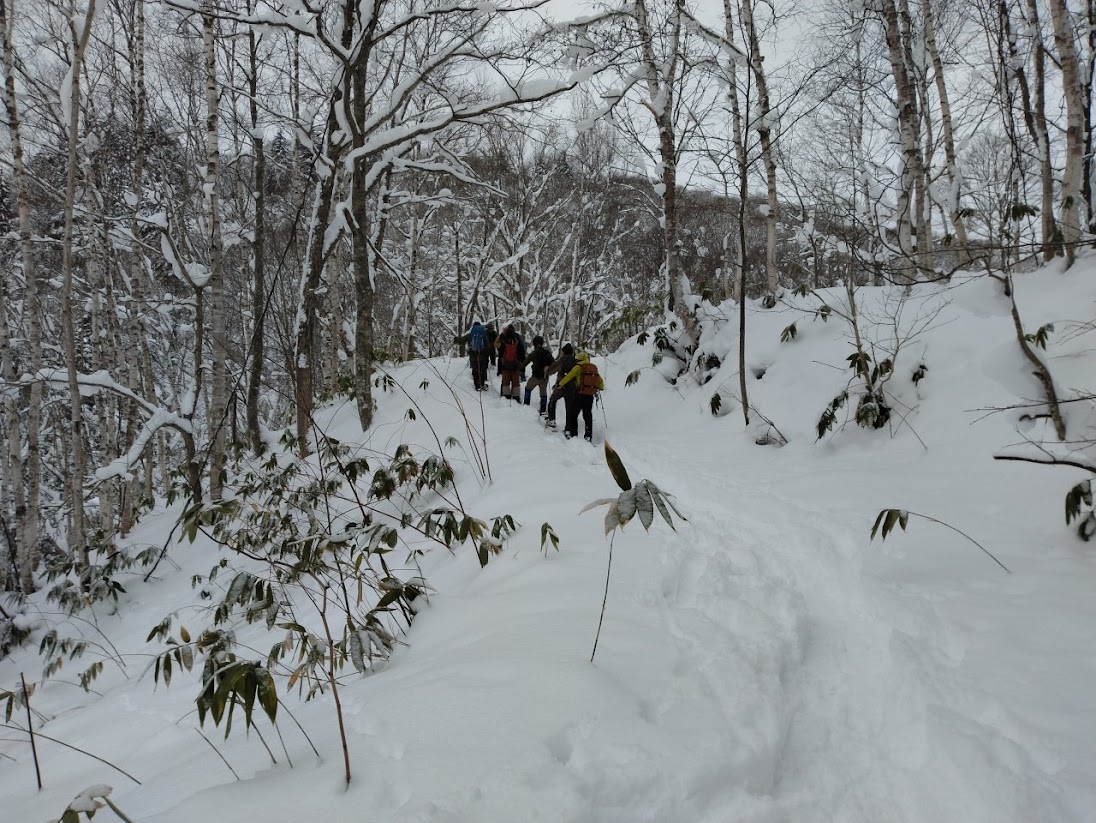 ここ最近になってドカンと雪が降ったのでもう大丈夫かと思っていたが、まだまだ笹藪だらけでうっかりすると藪の隙間に埋まってしまいそうになる。全員でラッセルを交代して進んだが、慣れないスノーシューの歩行に苦労しペースも上がらず残念ながら山頂の手前930m付近で行動停止とした。