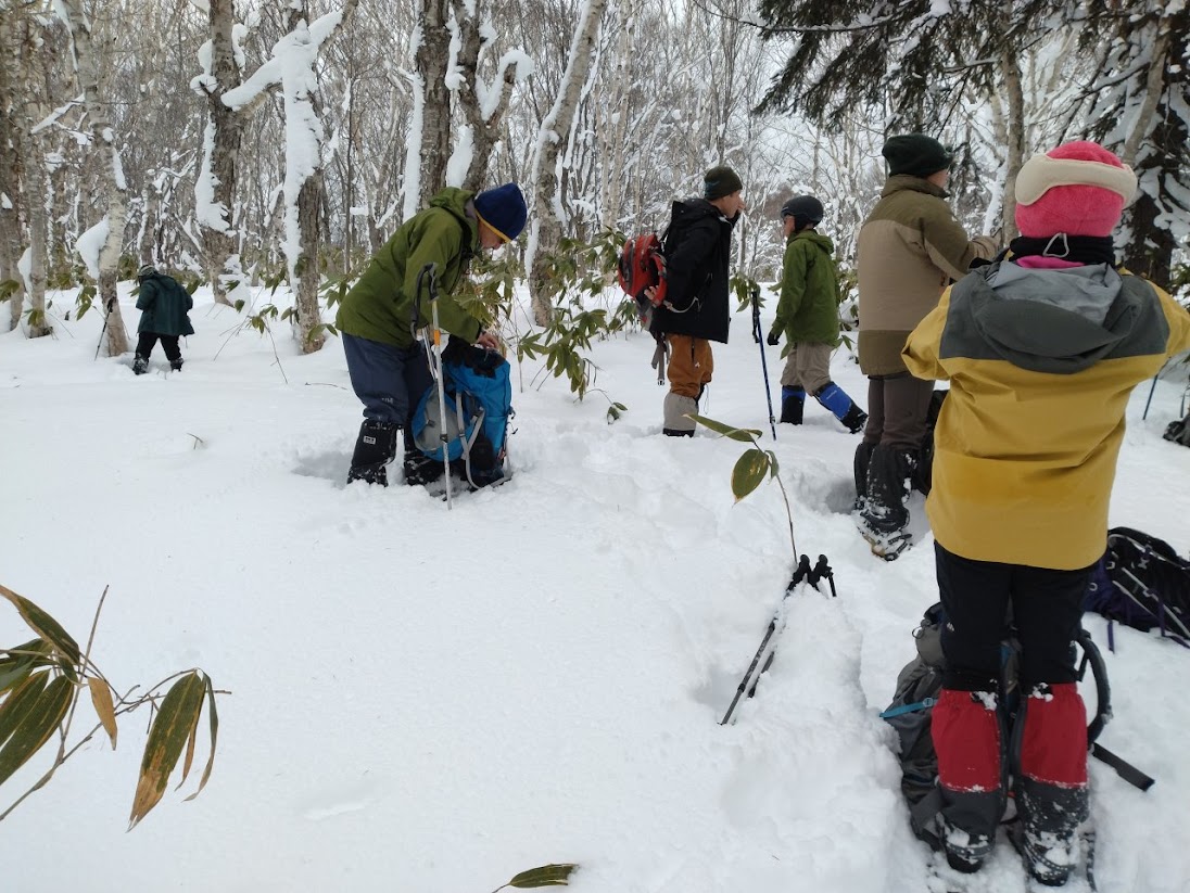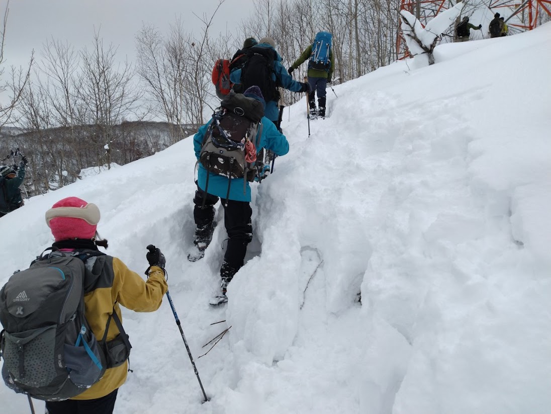 スノーシューによる雪山登山の新人訓練を小喜茂別岳で行った。当日のパーティは訓練対象者4名とコーチ陣8名の計12名の大所帯。