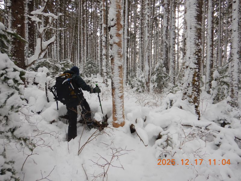 アイゼン歩行訓練をする目的で樽前山に向かった。かなり前から進入禁止となっている苔の洞門に沿ったルート。勿論トレースはないが、このところ高温気味だったので、雪が締まっていればという予想を裏切り、普通のラッセルとなるし雪は重い。洞門の左岸上は藪(笹&幼木&倒木など)がうるさく。歩行スピードにブレーキがかかる。ピーク到着予定時間になってもまだ樽前山のドームさえ見えない!やっと木立越しにチラッとドームが見えたところで、前進を諦め下山。背負ってきたアイゼン、ピッケルやロープが無駄に重かった。