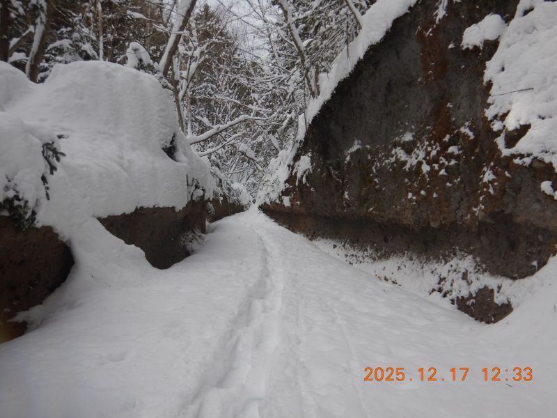 苔の洞門に続く沢のトレース、勿論我々の