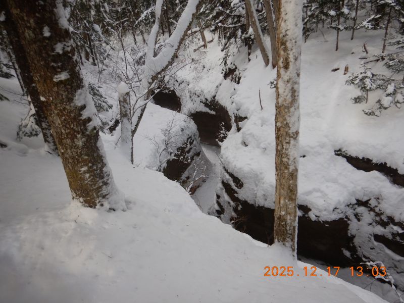 雪面が崩れよじ登るのに苦労する
