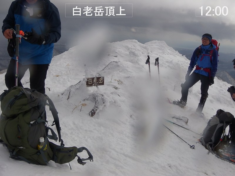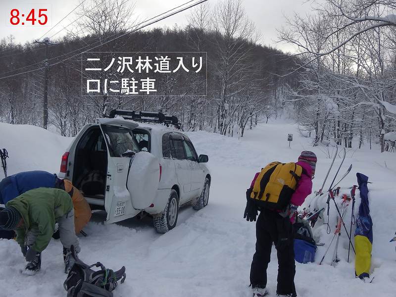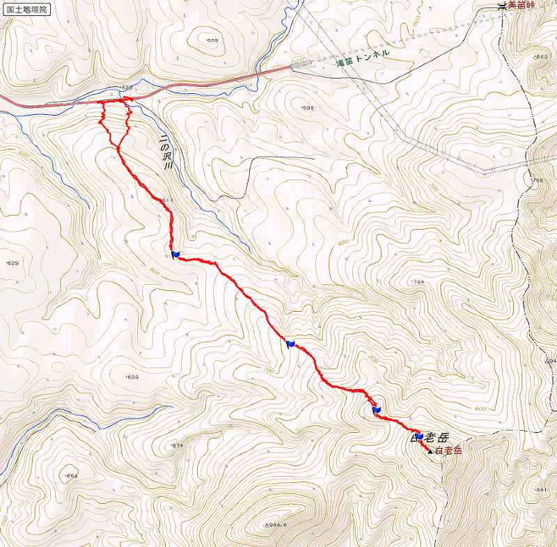 写真1−頂上で記念撮影。 写真2−GPSログ(頂上手前の青旗=930mあたり【11:44】でスキーデポし、つぼ足で頂上へ) 写真3−二ノ沢林道の入り口に駐車。【9:05 中笛橋を渡り、国道の雪壁をよじ登り出発。】 写真4−870mポコから南白老岳を撮影。 |