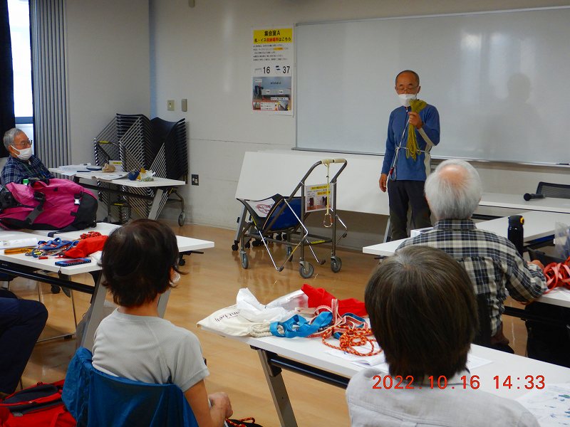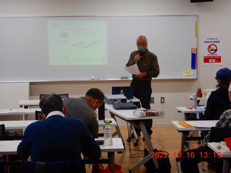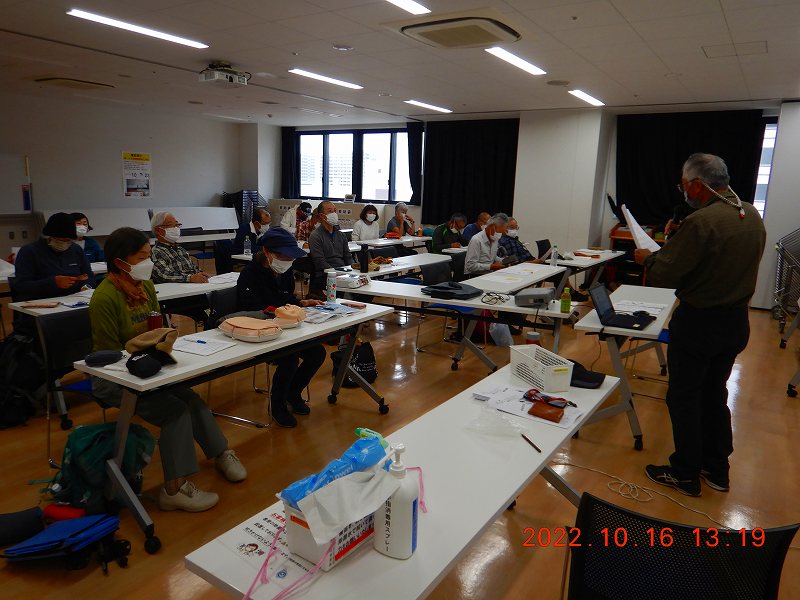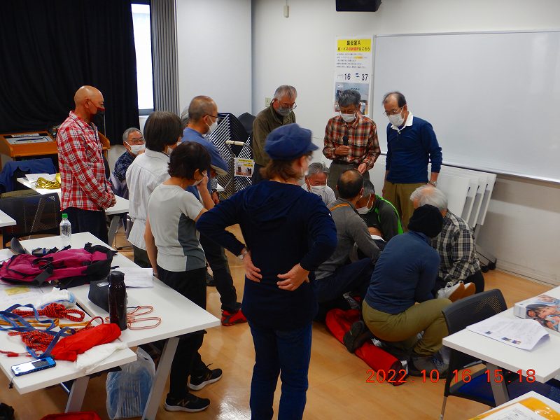 10月16日、白石区民センターで夏山遭難対策講習会を実施した。これは当会で毎年定期的に行っている。今回の担当はTさん、Kさん。総合講師を会員のMさんに依頼。テーマは「夏山で危険な状態に陥ったり、怪我をした時の具体的対応技術をお互いに教えあい、学びあう」。先月、当会の会員パーティが大雪で死亡事故に遭遇、救助活動の一部を担った。その報告が先日の例会で行われた。我々会員が、リスクに対しての対応の必要性を改めて感じているタイミングでの今回の講習会、ある意味ではタイムリーだったと思う。 |
