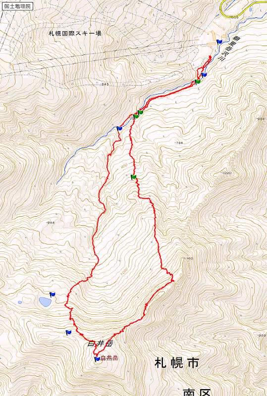 写真1−GPSログ:青旗は事前に登録しておいたポイント、緑旗は上りながらその地点、地点で登録したポイント。 写真3−間違った取り付き地点 写真4−9:16 990mにて撮影−前方ポコ1160mか? |