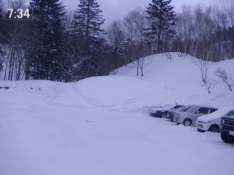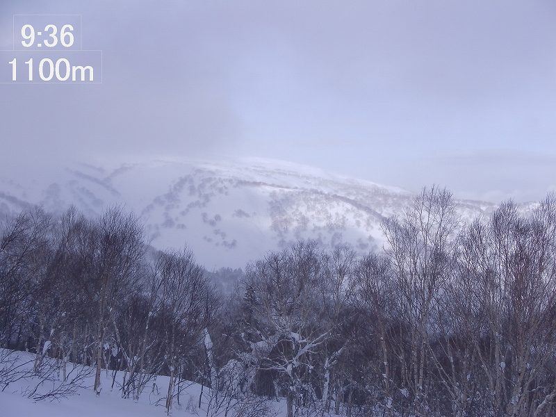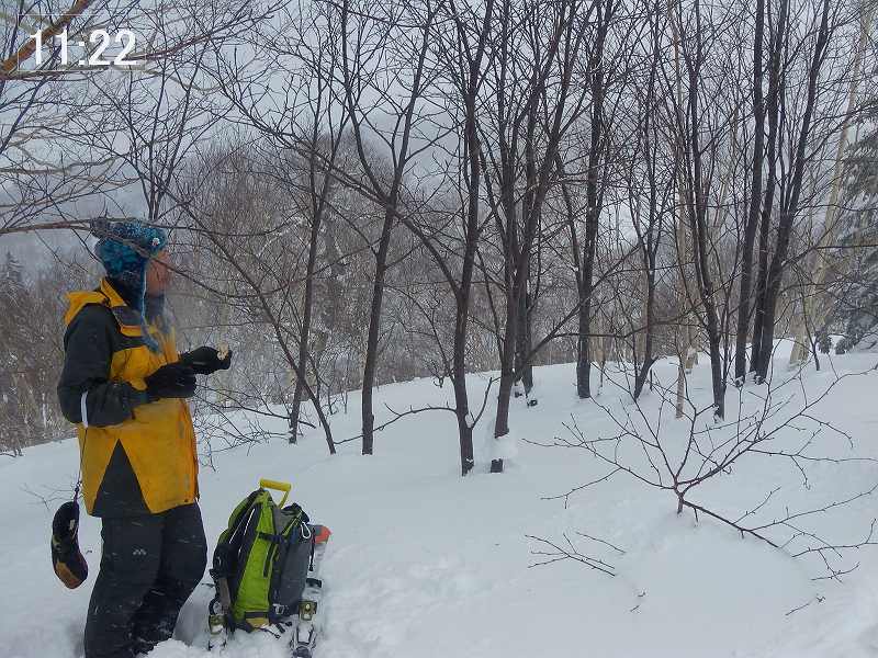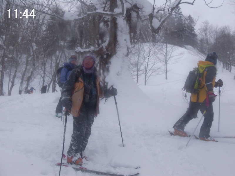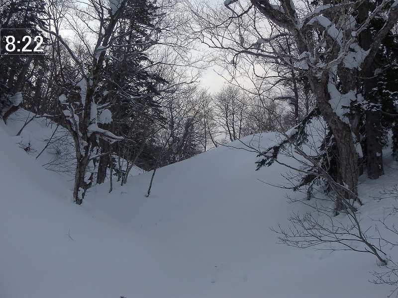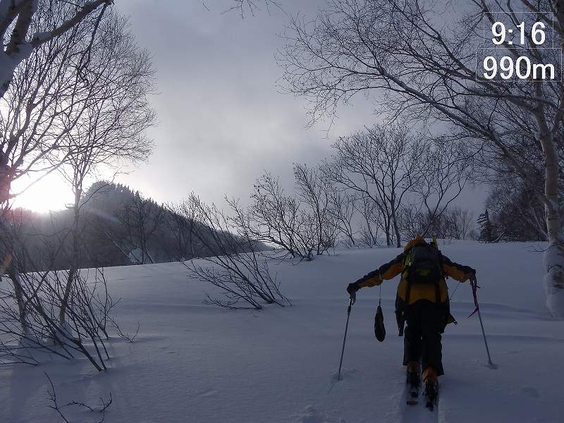 無風、曇り時々晴れの山行日和。7:55 駐車場出発 一つ手前の尾根から取り付い(帰り道、そこを通過したときにやっと一つ手前の尾根から取り付いてしまったことに気付く。)てしまい、気づかずに(見慣れない風景かな・・・と思いつつも)そのまま真っ直ぐ稜線上(9:48、1165m)に上る。地形図で見ると800mも右側の稜線上である。稜線上は狭く、左側(進行方向の左側)は雪庇が発達しており危険を避けて右側斜面を慎重にトラバースする。10:30 1200m付近で再び稜線に上り、そこからは稜線上を進む。(左側雪庇を避け、右側ぎりぎりを進む。) 10:55 頂上(頂上標識はなし) 着(上り 3時間)。ガスってきており眺望も望めず、すぐに下山準備。11:05 下山開始。 雪質はモナカ状態でスキー操作に苦労する。1090m付近から沢に滑り降りる。この斜面が今日唯一気持ちよく滑ることができた雪質であった。あとはひたすら沢中を滑って当初予定の取り付き地点に合流する(11:44)が、この段階でも取り付き地点の間違いに気づかなった。似たような景色なのである。気づくのは間違った取り付き地点付近を通過したときであった。