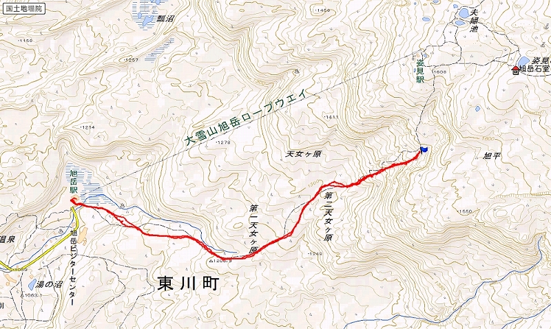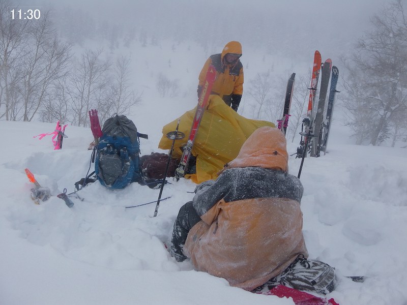 天気予報どおり吹雪、旭岳ゴンドラ駅付近では風はそれほどでもないが、姿見駅では風速17mありゴンドラは運行停止状態。サークル山行と臨時氷雪入門、別パーティーではあるが同時にスキーは履いて旭岳ゴンドラ駅を出発【09:00】。途中で、ビーコン訓練をする入門組と別れ、先へ進む。第二天女ヶ原まではゲレンデ整備車(圧雪車)で圧雪された道を快適に歩いて行く。そのあとは圧雪された道に別れをつげ、フルラッセルが始まる。30〜40cmほどのラッセル、久々のラッセルらしいラッセルで息が上がる。1,490mで行動停止【11:00】。しばらくして、我々のトレースを利用して2人の外人さんがスキーを担いでスノーシューで到着。外人さん2人組もここで行動停止した。 素晴らしいパウダースノーではあったが、新雪が深すぎて25°〜30°くらいの斜度がないと上手く滑ることが出来なかったが、全くの新雪斜面に自分のシュプールを描くことが出来て大満足の滑降であった。また、我々のトレースを辿(たど)って続々と登ってくるスノーシュー&スキーパーティーに滑りながら会うのは気持ちの良いものであった。いままでは先頭ラッセルの経験はほとんど無かったが、苦労してラッセルした疲れも吹っ飛んだ。 11時30分 1,320mあたりで滑落訓練、ツェルトを広げて張る訓練をしている入門組と合流。 写真1−新雪ラッセル 写真2−GPSログ 写真3−行動停止。後ろの2人は外人さん。【1,490m】 写真4−氷雪入門組と合流【1,320m】 | |