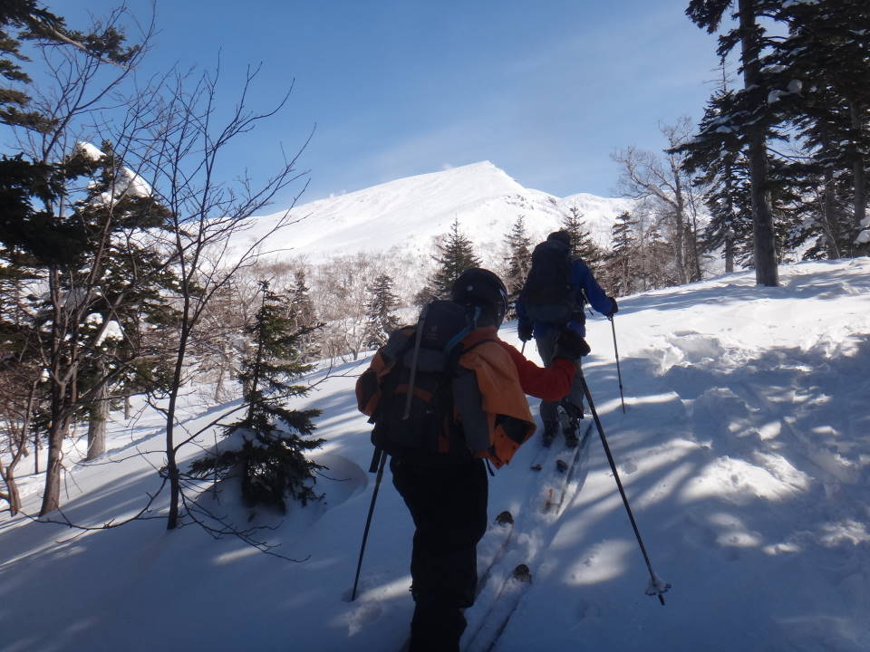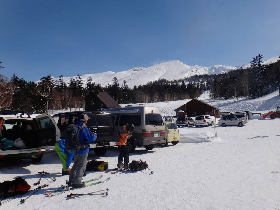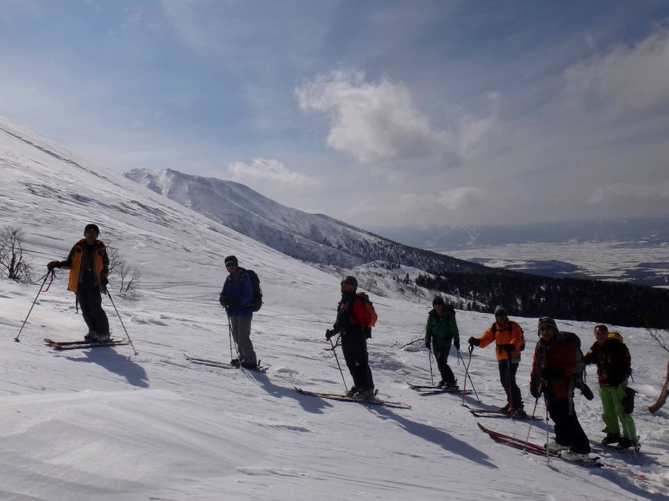 今年も八戸労山3名を含む8名で白銀荘に2泊して三段山に行って来ました。吹き上げ温泉駐車場は全くの快晴無風!早速に出発、前日より全く雪は降っておらずシュプールでズタズタ!1段目を登ると真正面に真っ青な青空の中に前十勝岳が見える。2段目を過ぎて富良野岳をバックに証拠写真!2段目を過ぎても空はますます青い!!誰のせいでしょう! |
