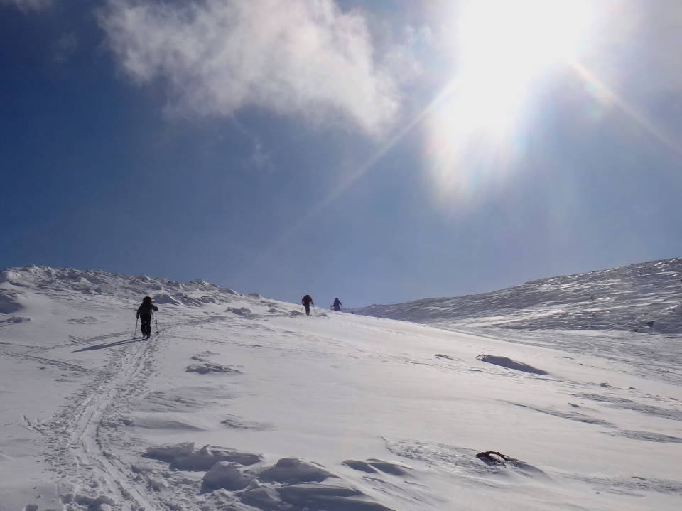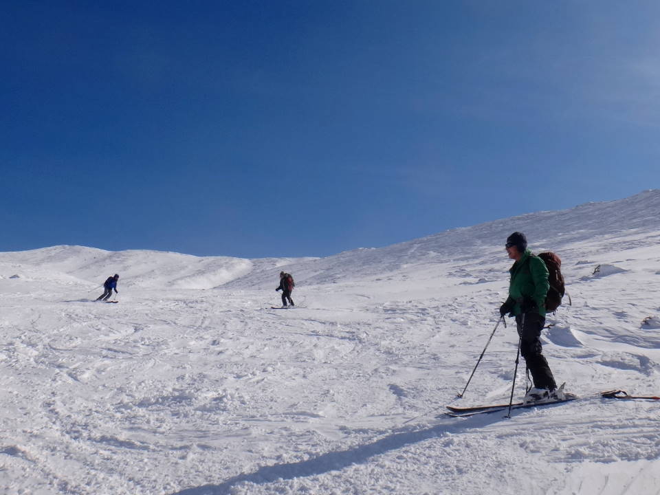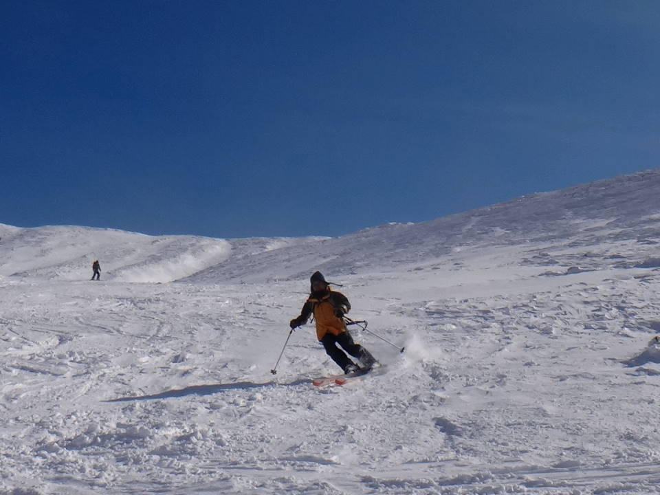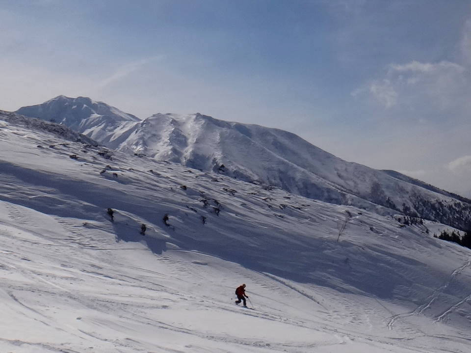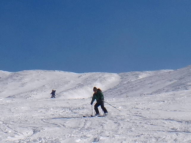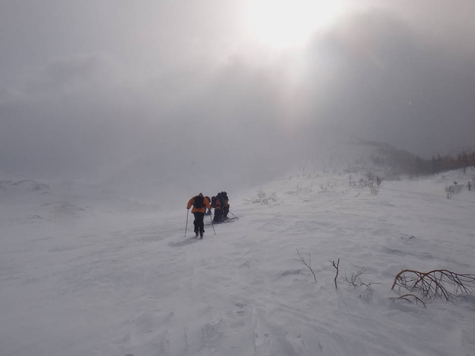 更に皆さんの華麗なる山スキーの姿も写してみました。天気の良いのは予報通り初日だけ!2日目からは爆弾低気圧のせいで大荒れ!前十勝岳に行ってみましたが、立っていられないほどの強風で途中退散し、三段山の林間コースをこれも2段まででその上はやはり立っていられないほどの強風でしたが、コースはかなりのパウダースノーで十分に楽しみました!3日目はフェリーも止まり私と八戸の皆さんは更に1泊しお酒と温泉を十分に楽しみました。 |