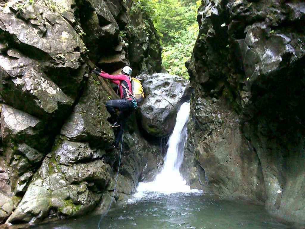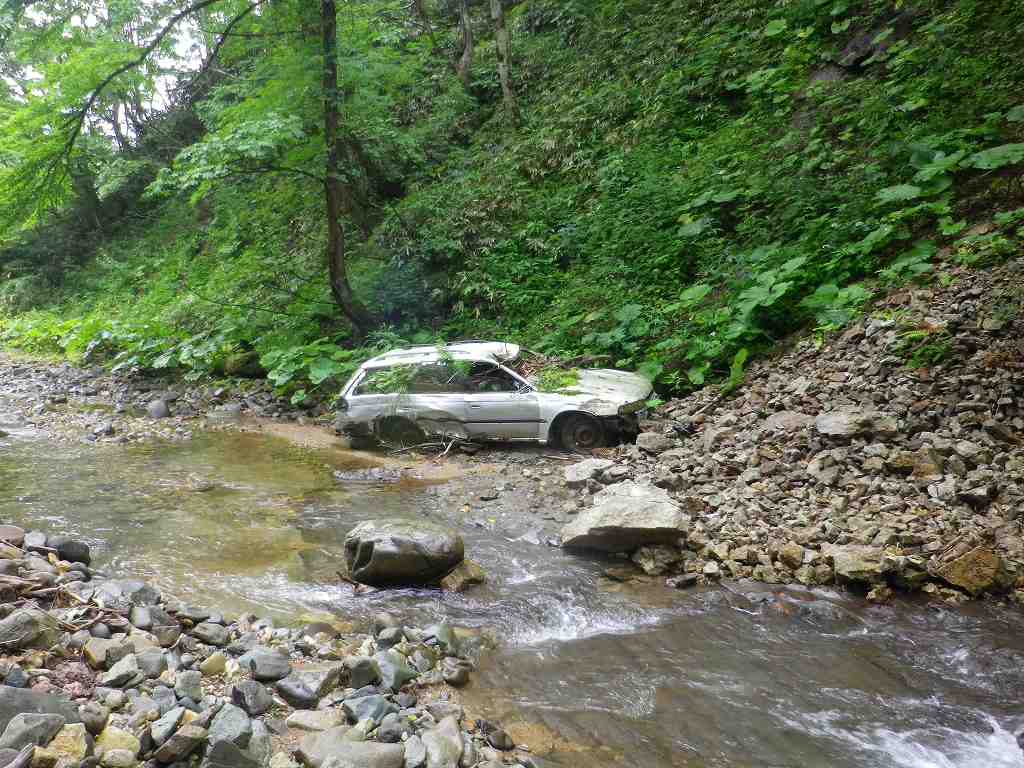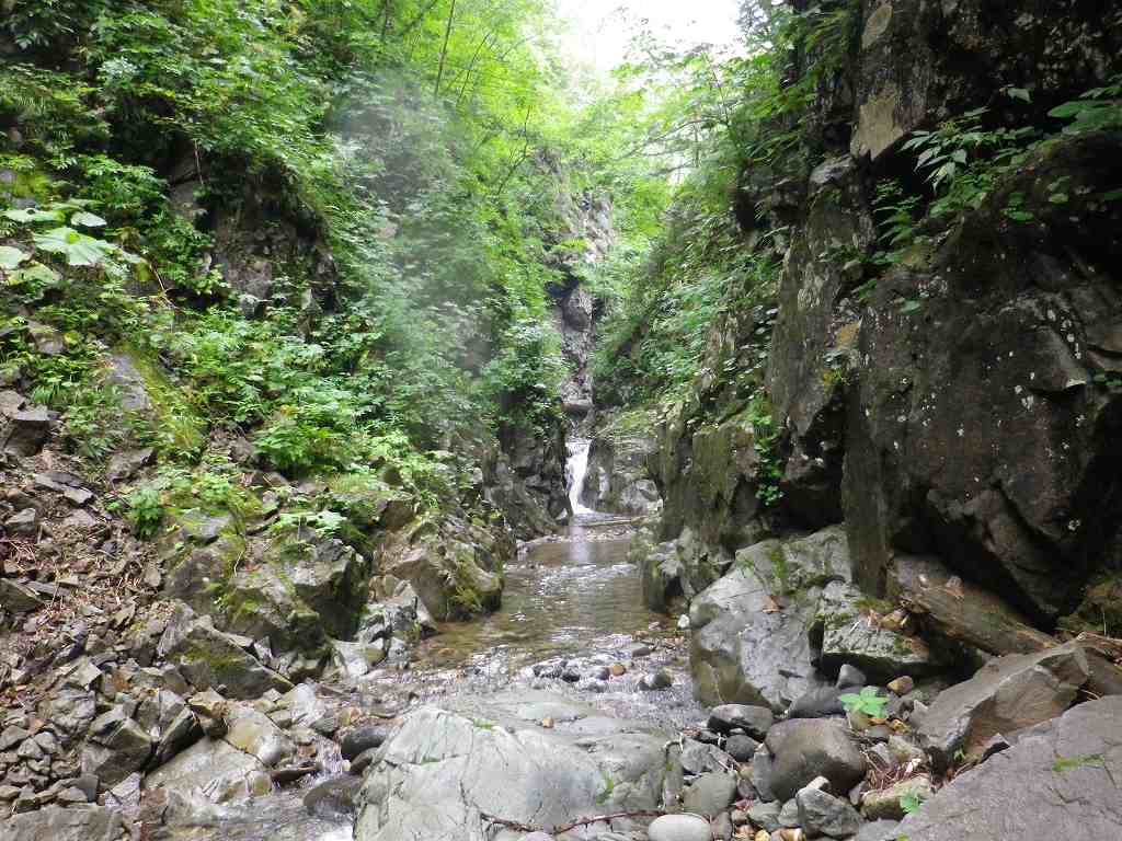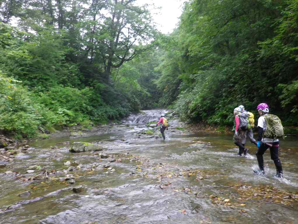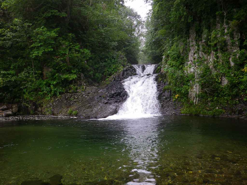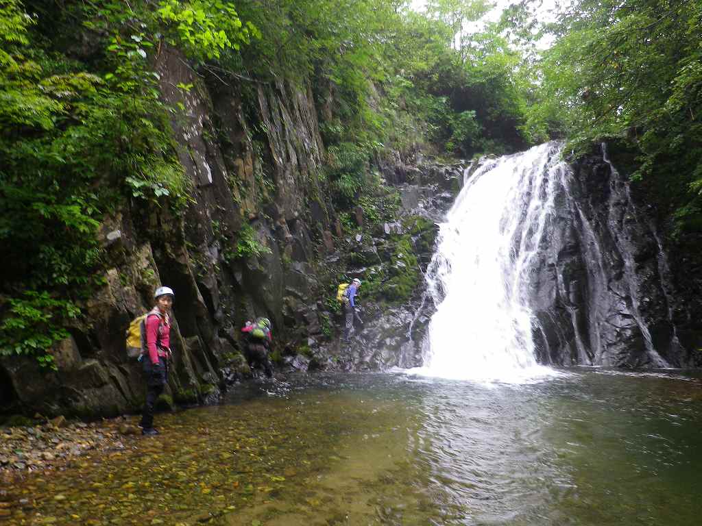 白老町から道道86号線を進み森野橋深沢林道ゲート前に車を止め、林道を1時間ほど歩いた作業広場のちょっと先から入渓する。いきなり最初に釜が現れ、そこは右岸をへつる。そこから1時間ぐらいきれいな滑や小滝が続き、深沢橋の二股を右側に進むといよいよ林道も途切れる。 謎のレガシーを過ぎて現れた最初の試練、横倒しになった流木でできた3〜4mほどの滝をシャワークライムし、お助けロープにしがみつき何とか突破する。 そして次に現れたゴルジュ、Jさんが右岸をへつって挑戦するがなかなかその先に進めず最終的に泳いで突破、続く我々はザイルをハーネスに固定し引っ張ってもらう。更に連続するゴルジュに体も冷え切ったころやっと本日の目標地点20mFが現れた。帰りは、何度も滝壺にドボンしながら、途中から林道をひた歩きし下山した。
