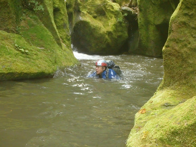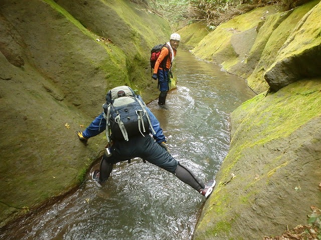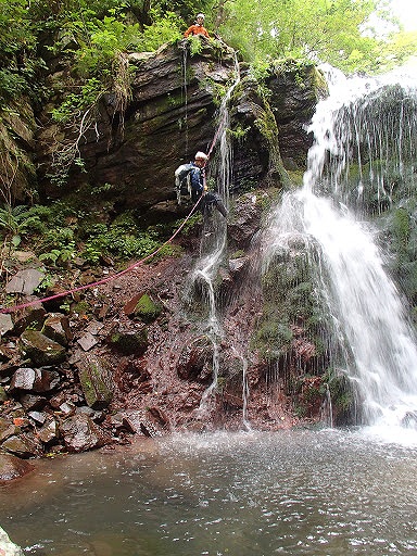 8月29日(土)個人山行で『飛生川』に行ってきました。300m林道に駐車し、約50分林道歩きで330mから入渓。左股を220分岐まで下り、そこから右股を遡行し、300m林道駐車位置に戻った。330m入渓→左股下り220分岐までは「楓沢」に水が流れているイメージでとても変化にとんだ渓相!!懸垂下降あり、へつりあり、ゴルジュ泳ぎありで大変面白かったです。220分岐からの右股は、滝もゴルジュもなく、荒れた沢が続いていた。来年は85mから入渓し、160分岐左股→220分岐左股を遡行してみます。 | |