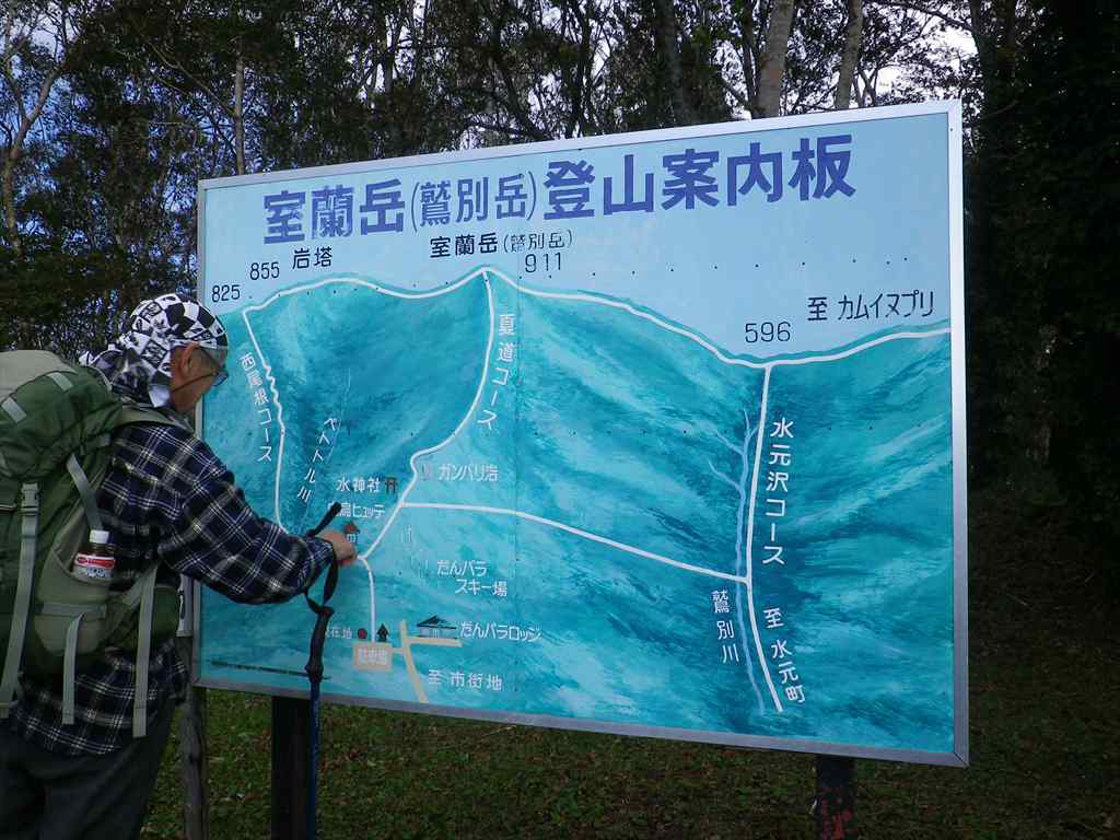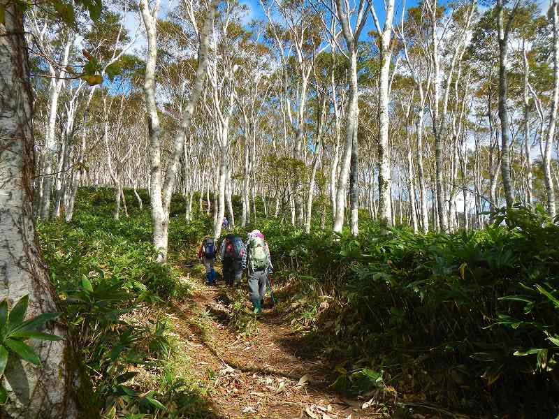 私たちAチームは男性4人、女性3人の7人パーティです。室蘭岳からカムイヌプリをめざし歩きました。落ち葉を踏みしめながらの縦走は気持ちのいいものです。少し小雨に当たりましたが時々陽も差し気持ちよく歩きました。