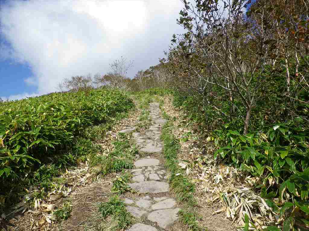 スキー場の登山口出発 | 市民登山の日というイベントで大勢の人がおりました | 石畳のような登山道 | 室蘭岳を下って振り返る | |