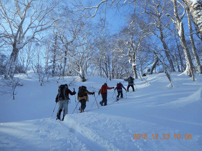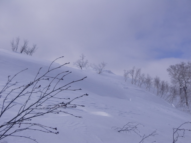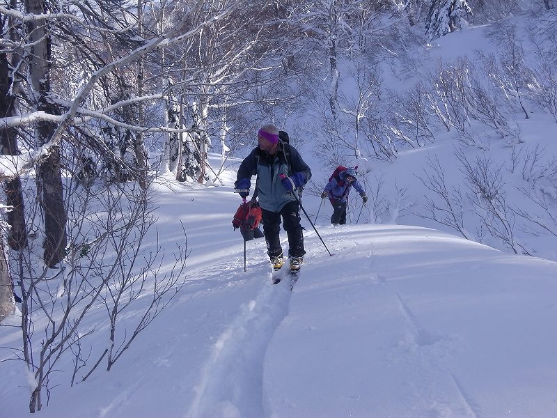 晴れ、微風。駐車場にはすでに2台の車あり。胡桃沢林道にトレースあるも、15分ほど進むと先行者トレースは夏道へと向かう。あとは我々パーティーがすべてラッセルするも足首ほどのためそれほど苦にならない程度であった。このコースは、前回(2015.3.29)初めてであった(札幌のOさん、h u-noさん、私)がスムーズなコース取りで千尺まで到着したが、今回はしなくても良いアップダウンをいくつかしてしまった。(前回はトレースがあり、そのトレースを辿ったのかも知れないが、記憶は定かではない。)雪は少なく、千尺高地直下の大斜面もブッシュがうるさくまた雪もクラスト状態で四苦八苦のスキー滑降であった。 登り 2時間55分、千尺 休憩 20分、下り 1時間15分、総行動時間 4時間30分 |