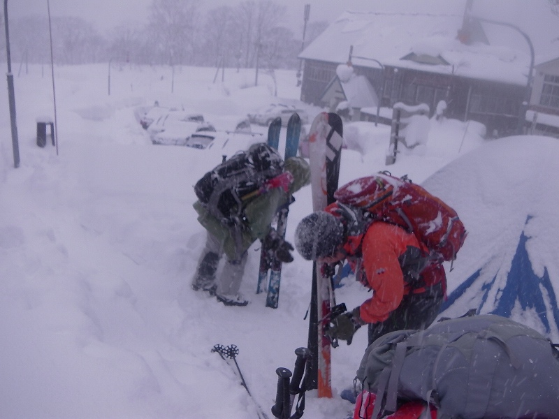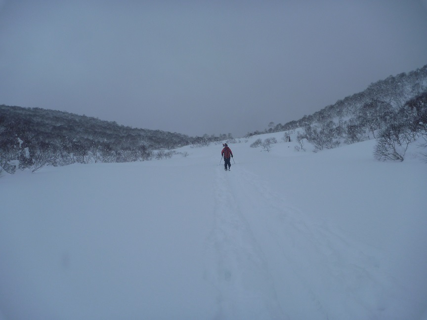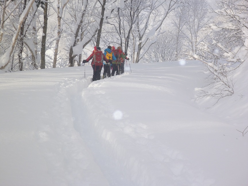 リーダーM・SリーダーH生さんのもと行ってきました。16日11時すぎ今年3月に廃業となる新見温泉のゲート前に着く、曇りで雪がチラチラ、既に車が数台止まっており山に行っている様子。ゲート傍のホテルに車の止めて良い場所を確かめて駐車する、そしてゲートのすぐ奥にテントを張った。16日は新見の沢川のSBの確認と862mのポコ付近までの散策として6名で11:50発 道路沿いに進み沢に降りる処で2名が戻ってきてSBの話、かなり際どいとのことだった。大人数のパーテイがそこを渡らず止めて戻っているらしい。我々は確認もあり向かう、12:45ころSBの手前に着く、しばらく様子を見て検証?危険と判断して戻ることになる。新見峠に向かう結構なラッセルをしながら登ったが道路に出た処で行動停止しする。テンバに戻るには道路の傾斜が少なくラッセルもあり来たところを下ることにそこそこ滑れた、14:20テンバに戻る。少し早かったが安着祝いを始めた。沢山持ってきたアルコールもあり、それぞれとっておきの?話やタラ鍋など食べ。特にH生さんの話が盛り上がったと思う、夜も更け10時近く GN。 |