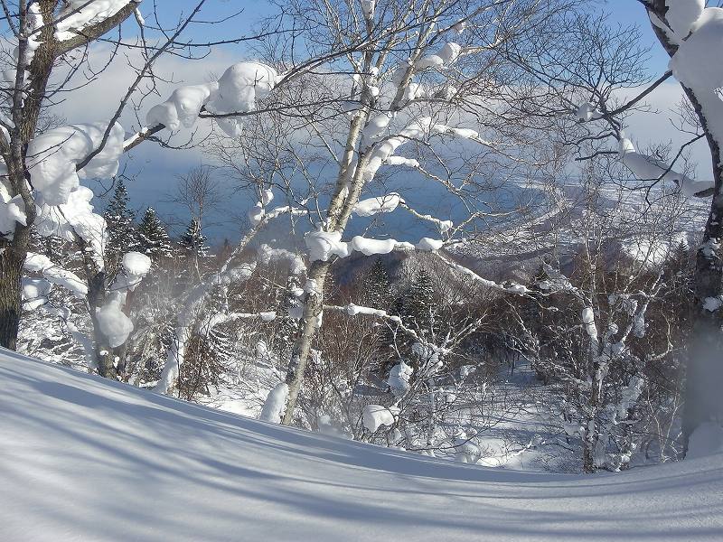 GPSログ:緑は6日、赤は7日 | 7日、快晴のなか銀嶺荘を出発 | 春香山ピークからの極上パウダースノー斜面をスノーシューでてくてく下るお二人さん。なんともったいない〜♪♪ | 石狩湾 | |