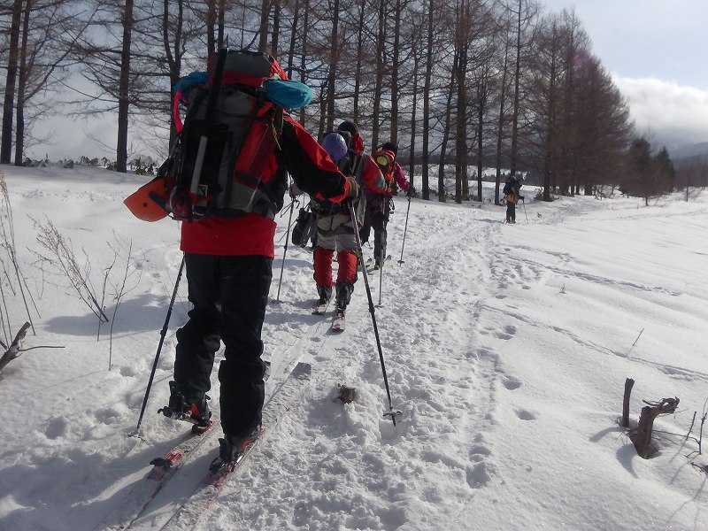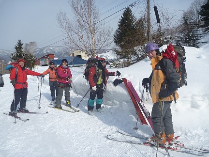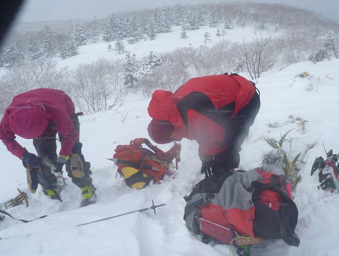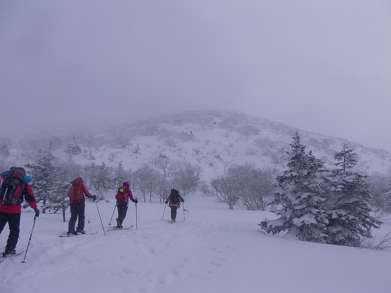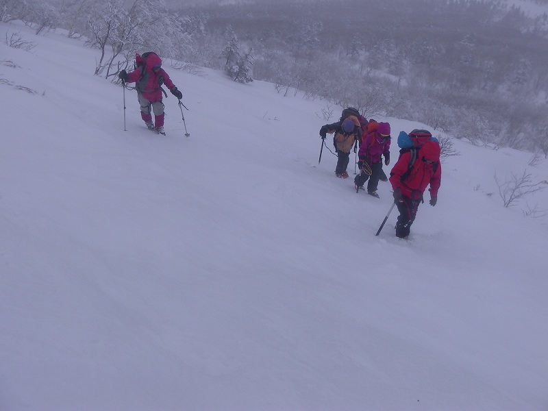 L M浦 SL Oさん 入門 S美樹さん他3名。全員ピッケル・アイゼン・ハーネス・ヘルメット持参の久々のフル装備です。登山口では好天でしたが上部では曇り風が強く寒い一部ウインドクラストしてきたため全員スキーをデポアイゼンをセットする。入門者のアイゼン(借りた)の調整が不十分のためリーダーが調整を色々試したが合致せず、メンバーのアイゼンで訓練を受けることになった。その間全員が寒い中 長々と待機する。山行中のトラブルの大変さを体験した。やっと準備ができアイゼンでの歩行・滑落停止訓練・ピッケルを使ったセルフピレー・コンテイニアスなど をじっくり行う。ピークは目指さず下山。上部は10cm位のパウダーで良かった。 入門のS美樹さん又ピッケル・アイゼンを体験できる山行に参加してください。 リーダーで講師のM浦さん寒いところ御苦労さまでした。 |
