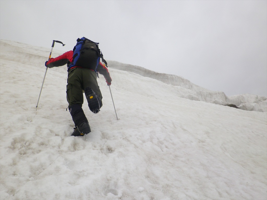 これで今シーズンの滑り納めとしてチセヌプリに行ってきました。メンバは、S水さん、M村さんと私の3人。計画では、チセヌプリからシャクナゲ岳までの予定でしたが、現地まできてみると見事に雪がなく縦走は早々に諦めました。 スキー場はまったく雪がありませんでしたがニトヌプリとのコルまでいくとそれなりに雪がつながっていたため、その付近の道路脇駐車場に車を止めてスタートしました。天気は良いのですが風が強く吹いていました。 キックターンを繰り返しながら急斜面を登っていきます。途中のブッシュを超えて雪庇の真下まで来ましたが、風が強く危険を感じたためその付近で行動停止とし、そこからスキーで滑走しました。登り1時間下り15分のあっという間の登山でした。 下っていくと最初我々だけだった駐車場には車が満杯状態、来ていた人に聞くと、ここはこの時期の最後残された代表的なスキースポットだとか。我々が帰り支度をしていると次々と出発していった。
