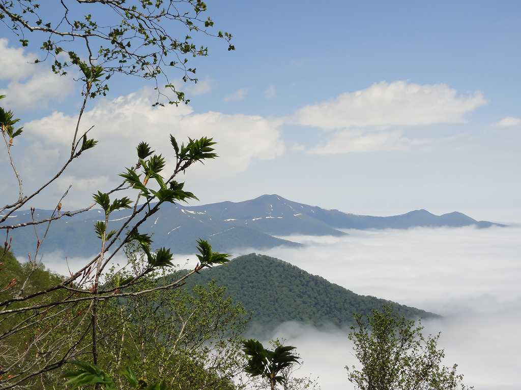 今年も伏美岳に行ってきた。ムラサキヤシオツツジは花のトンネル付近は残念ながら終わっていたが、上の方はまだ咲いたばかりの物もあった。下から上まで満開の夢景色に出会えるのは気象状況の不思議に左右されるようで、数年に一度の幸運に恵まれなければならないようだ。 下界は一日中雲が付いていたようだが、私達は雲を突き抜け晴天のPへ。雲海をたずさえた残雪の日高の山並みを堪能した。この時期の日高稜線は一際美しく、何処までも細い稜線を歩いて行きたい気持ちを駆り立てられる。 | |