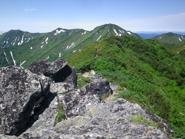 ピパイロ岳までは道のりはしっかりとし危険なところも迷いやすいところもなく一級国道並みである。ピパイロ岳ピーク近くに残っていた雪渓を見て、山頂ビールを用意してこなかったことを強く後悔した。風のないピパイロ山頂で20分ほど山座同定をしながらのんびりした。