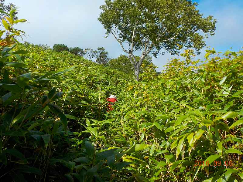 札幌岳登山口に車をデポし,Mさんと空沼岳登山口から歩いた。8月は多雨だったが山道に異状は認められなかった。空沼岳−札幌岳の縦走路については,道型はほぼしっかり残っている。ただし,両側から覆い被さる背丈を超えるクマザサを両手でかき分け道型を確認しながら進む区間や,トラバース道が傾斜している上に滑りやすいクマザサを踏むため,手でクマザサを掴んで進むところが少なからずあった(縦走路の3〜4割程度か)。このため時間がかかったうえに疲れた! 縦走路は2012年にササ刈りされたそうなので,4年間の自然の回復力?はすごいというか,あまり歩かれていないというべきか。 ・空沼岳登山口 6:30 ・空沼岳 9:50 ・ヒョウタン沼 12:15 ・札幌岳 14:40 ・札幌岳登山口 17:10