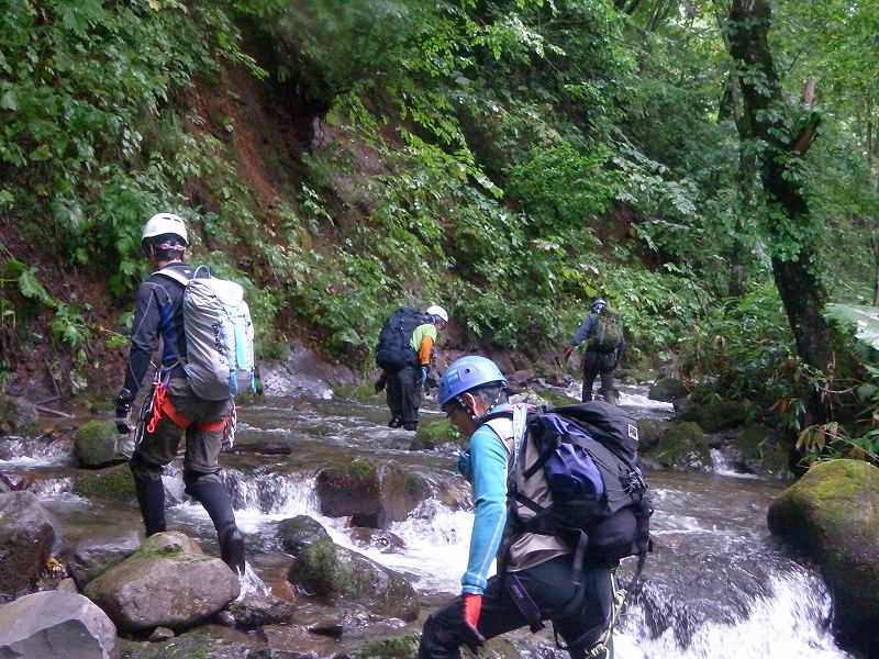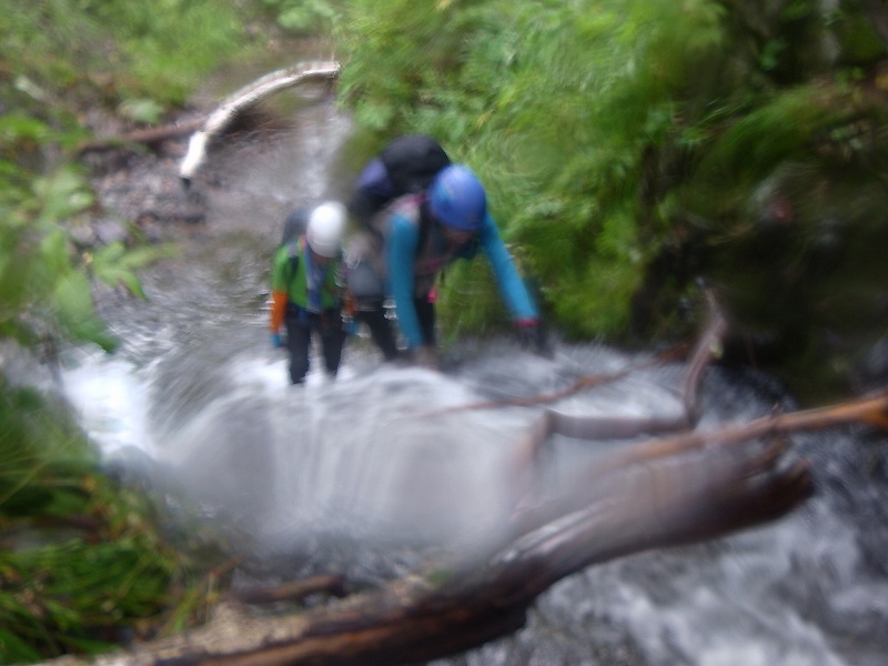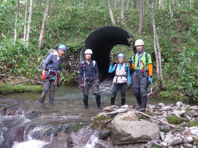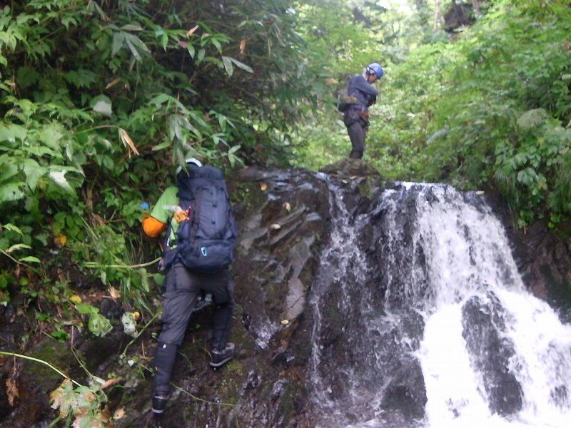 当初、予定していた豊平川本流ルート(1128峰)、途中林道を重機がふさいでいて通れず。やむなく戻り、今度は豊平峡大橋を渡ってすぐに駐車し、狭薄沢川から狭薄山1295.7mを目指す。水量も多く、入渓前の林道も水が流れて小川となっていた。この日はリーダーAさんお腹の具合がいまいちで11:15滝を上がったところ880m付近にて行動停止し、引き返すことに。駐車地点480m(豊平峡大橋を渡ってすぐ)から林道歩き30分ほどで入渓。1時間ほど川歩き(この間は滝、なめもなしのただの川歩き)して670m(土管があり、その上に林道あり)で再び林道に出る。40分ほど林道歩いて再び入渓760m地点。ここからやっと滝ありなめありの沢遡行らしくなる。下り、一度ロープを出して懸垂下降する。次回は狭薄山1295.7m頂上まで行ってみたいと思う。登り3時間5分、行動停止地点にて休憩20分、下り2時間30分、総行動時間5時間55分 |