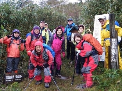 10月の会山行ということで目国内岳と岩内岳の交差縦走を予定していたが、あいにくの天気のため、目国内岳のみのピストンに変更となった。前泊組と当日集合組が五色温泉に集合し、新見峠の登山口に向かう。その間にも天気はころころ変わり、「神仙沼散策でいいか…」という気持ちになったが、メンバーは身支度を整えているのでとりあえず前目国内岳まで行って様子をみようということで出発した。幅が広く歩きやすい登山道で、雨やあられが降る中ではあったが無事に前目国内に到着。風も思ったほど強くないので、目国内岳まで歩くことにした。なだらかなコルに下り、登り返す。目国内岳山頂は、大きな岩がゴロゴロしていてなかなか楽しい。高所恐怖症の私は、狭い山頂で風に吹き飛ばされたら大変…とばかりにすぐ退散した。今年は天候に恵まれないことが多かったが、それでも無事に山頂に立てて満足満足♪ |