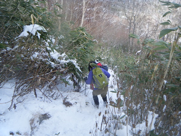 うっすら雪が積もる道 | 下山開始 | 銀嶺荘にて | もうすぐ登山口 | |