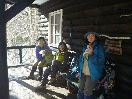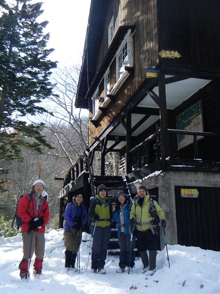 麓は黄葉が奇麗 | 気持ちの良い登山道 | 小屋ちかくは20センチ位の雪が | 銀嶺荘の前で | |