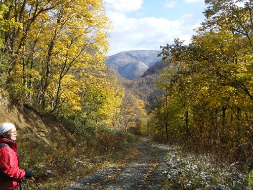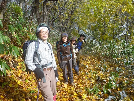 夏山納めで春香山に行ってきました!落ち葉のじゅうたんが敷き詰められた道をおしゃべりしながらゆっくり登りました。今年は天気に恵まれない山行が多かったのですが、今回はその帳尻合わせのような晴天でした。メンバー5人のうち2人は銀嶺荘でコーヒータイムをとり、残りの3人は山頂まで登りました。前の晩に積もった雪で、頂上までの30分はおっかなびっくりでしたが、息を切らしながら頂上に立つと、360°の眺望が…。夏山納めと冬山始めがいっぺんに楽しめた山行でした♪ |