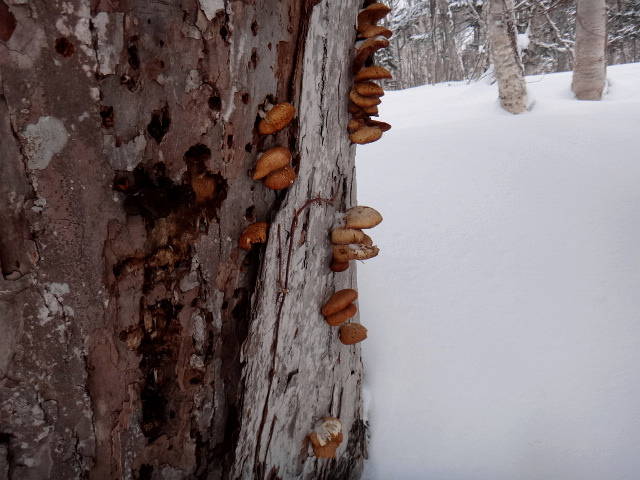 写真をもう少し!途中で何と!ムキタケ発見、残念ながら凍っておりました。途中で少し晴れて背後に左尻別岳、右に羊蹄もかすかながら見る事が出来ました。頂上では新たに作ったと思われる標識がありました。 | |