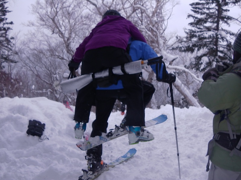 GPSログ(google earth &地形図2つ)と故障者背負ってのスキー歩行の写真 故障者を背負って歩くことは可能(男性を背負って歩くことは<当然、体重によるが>無理であった。)だが、滑ることは不可能であった。 |