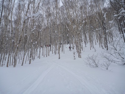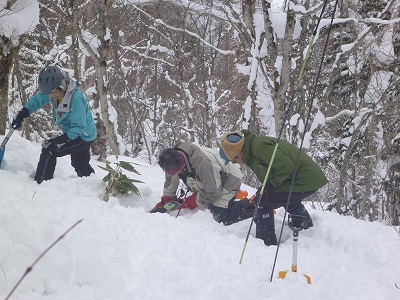 中山峠付近で講習会があり参加した。リーダーS水さん・M井さんのもと計12名が参加し国道そばから急斜面を直登し863mのピーク近くでビーコン探索・ツエルト張り・故障者の移動などを行った。風もなく昼前に終了しうるさい木々を縫いながら滑り降りた。パウダーで疎林であればと思ったが。リーダー・サブリーダー・dodosan有難うございました。 |