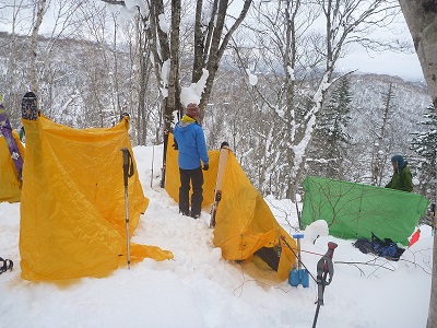 国道を下に見て登る | S水チーム ビーコン探索で苦労 | ツエルト テント村出現 | 木々を縫って滑る | |