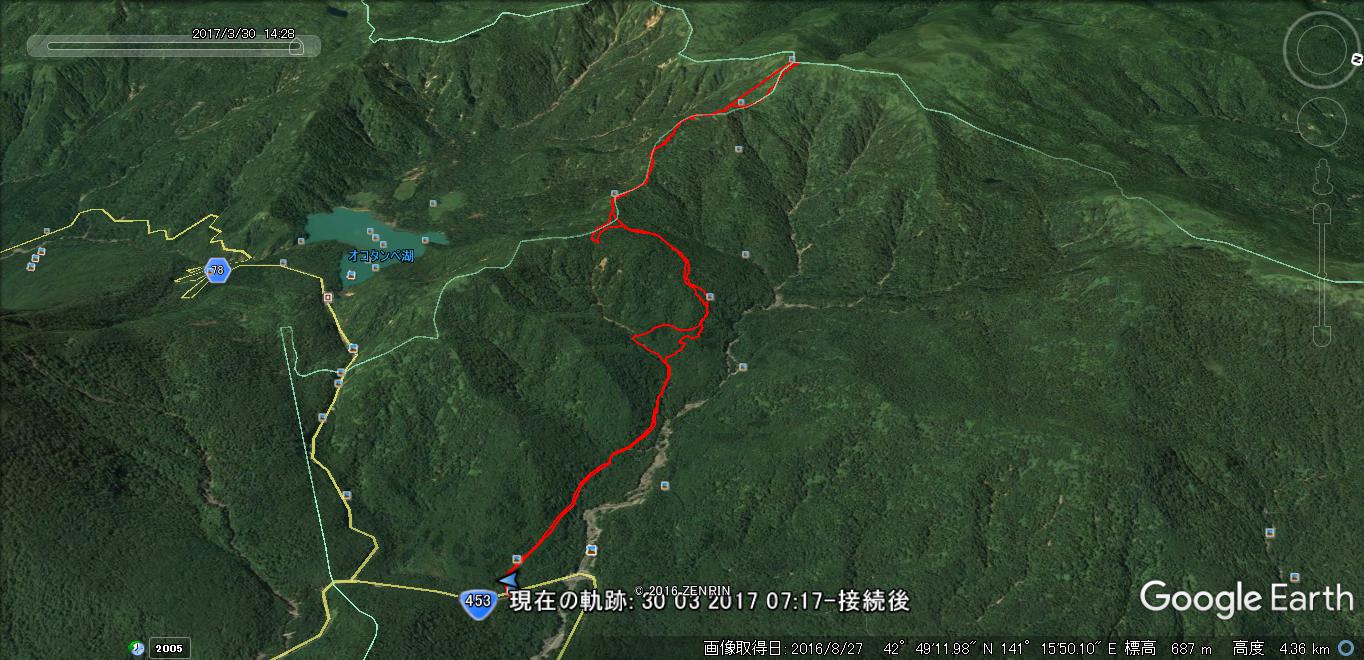 天気悪し。(雪降り&ガスっていて頂上での眺望まったくなし!)ただし、風が弱かったので頂上まで行けた。頂上直下は雪庇があり、右側に回り込み雪庇切れた地点から上がり頂上に立つことができた。1120m付近(10:40)からスキーアイゼン装着。下り910mあたりから登りトレースを外れてしまった。一番間違えやすいと認識していた地点で間違ってしまった。シール付けて登り返し35分ほどロスして登りトレースに合流する。ここは登り時点でしっかりとルート旗を付ける(2本方向性をもって)べきであった。 ★オコタンペ湖でジンギスカン食べている○高パーティーを『漁岳』頂上から見れるかと思ったが(双眼鏡持参したが)、眺望まったくなく残念〜 (^_-)-☆ 07:30 駐車地点 発 11:55 頂上 着 12:10 下山開始 14:25 駐車地点 着 *下り、道間違いし35分ほどロス(シール付けて登り返し、登りトレースに合流。) |
