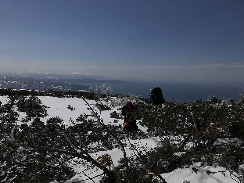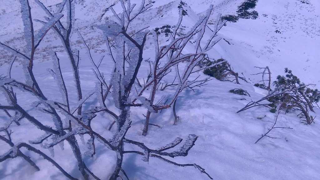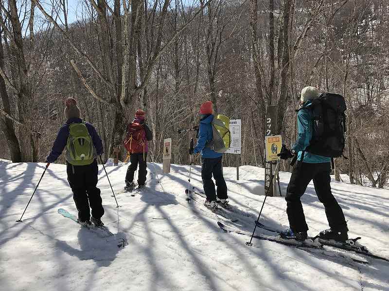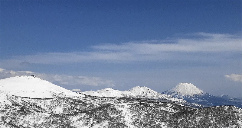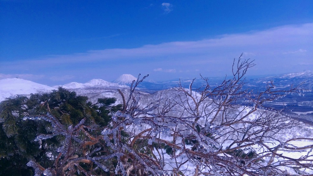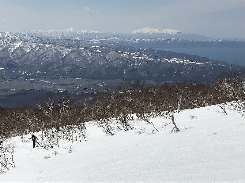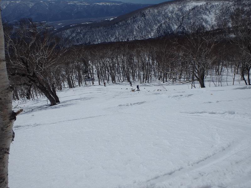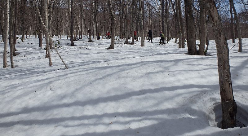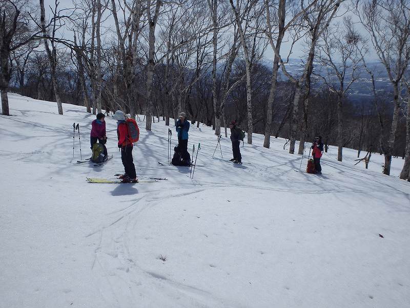 先週と反対の蘭越から雷電山途中のco1046を目ざして、6人で行ってきました。林道に雪が出始めた所に車を置いて約35分ほど歩き、コックリ湖への遊歩道分岐から尾根に取り付き、後はほぼ一直線に尾根を登ります。co1000m付近からのニセコ連山が一列に並ぶロケーションはすばらしい!! 最終地点から雷電山までは少しアップダウンがあり、もう少し時間に余裕を見ないと到達できそうにありません。 予定通りco1046で終了。ハイマツが顔を出してやはり風が強く寒いのか、枝の先はキラキラ凍り付いていました。 帰りはほぼ南斜面!!斜度一定、疎林、一部オープンバーンの快適な斜面で、とろ〜り、シャバシャバの春雪をへたくそな私も快適に下ってきました。 別のアプローチもできそうで、次回はそちらから行ってみませう。 |