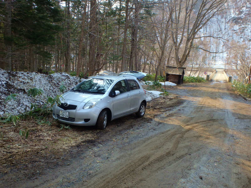 百松橋を渡って出発 | 荒れてる林道、真ん中に大きな木が。 | 福寿草が2輪 | ここが百松沢 | |