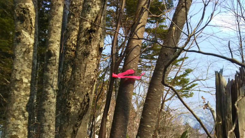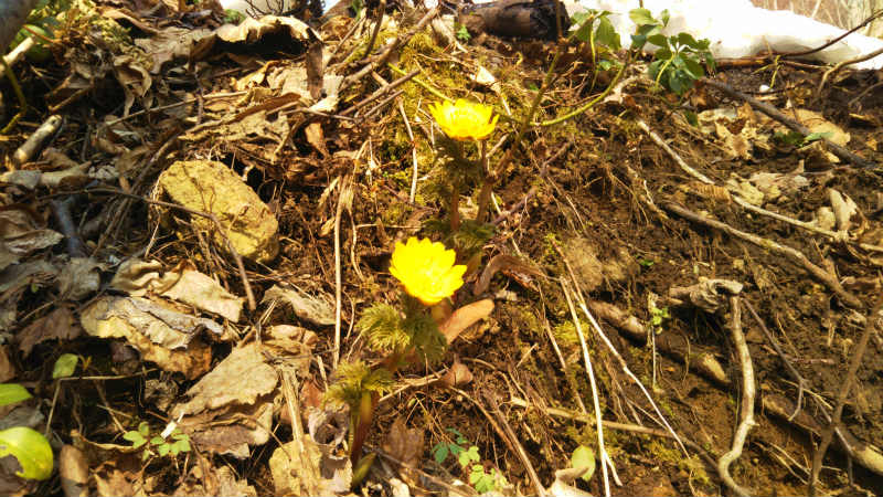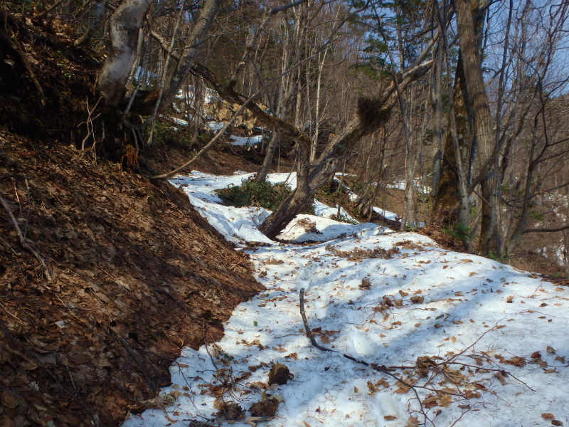 百松橋を渡って駐車、神居沢林道から出発する。林道は荒れて倒木が多く、小石も転がっていたが、南斜面なのでだいぶ雪解けが進んでいて、気の早いカタクリ、福寿草、ナニワズが1〜2株咲いていた。林道から尾根を辿って行くとなんか変、小高いところがなくどんどん上がっていく。行き過ぎていた〜。戻って三角点を探したが、それらしい場所には倒木が重なっているだけでお決まりの赤テープもない。GPSで特定して自分でテープをつけてきちゃった…。そのまま尾根を上り続けると神威岳への夏道にぶつかるはずです。 |