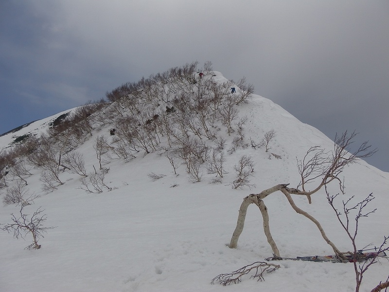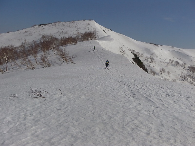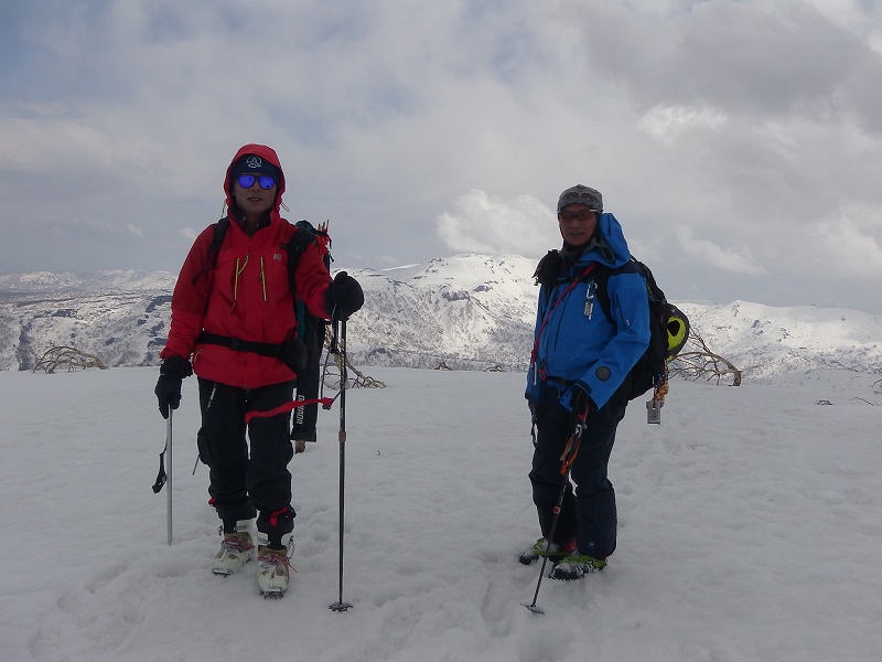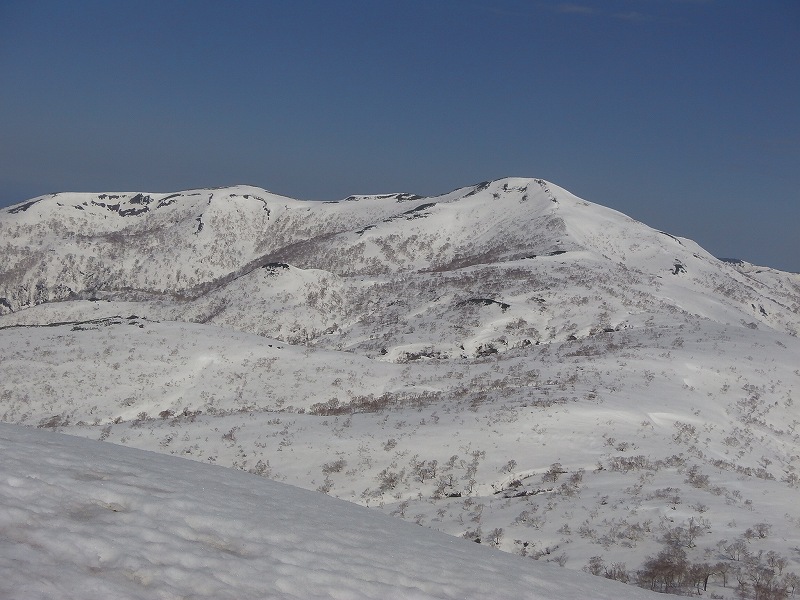 だだっ広い雄冬山頂上(1198m)にて。バック中央は暑寒別岳 | もうすぐ浜益御殿(1039m)<前方ピーク> | 浜益御殿から雄冬山を撮影 | 急登下のスキーデポ地点に向かって下る | |